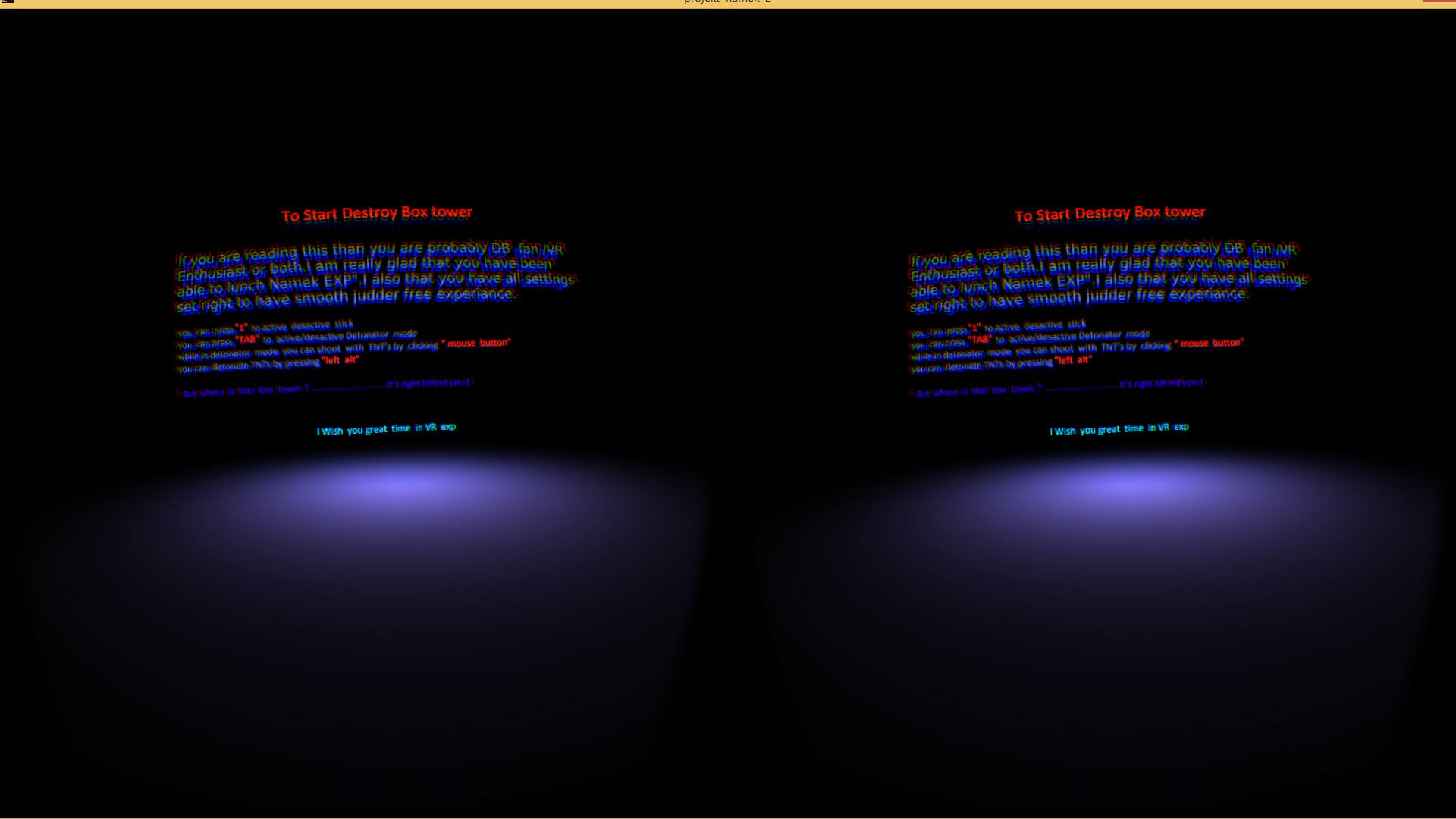 When you first load up the experience, you see a welcome screen that introduces the game and offers the link to the webpage. The title page is careful to state that this is a “project-stage alpha,” which translates to: “this is going to be rough around the edges.” There are explosions happening around the titles, but nothing that suggests what you are supposed to do from here. Turning around completely, I see off in the distance a text box, and seeing no other option, begin the journey over to it. I say journey because for some reason this was placed about a 20 second walk away from the initial titles.