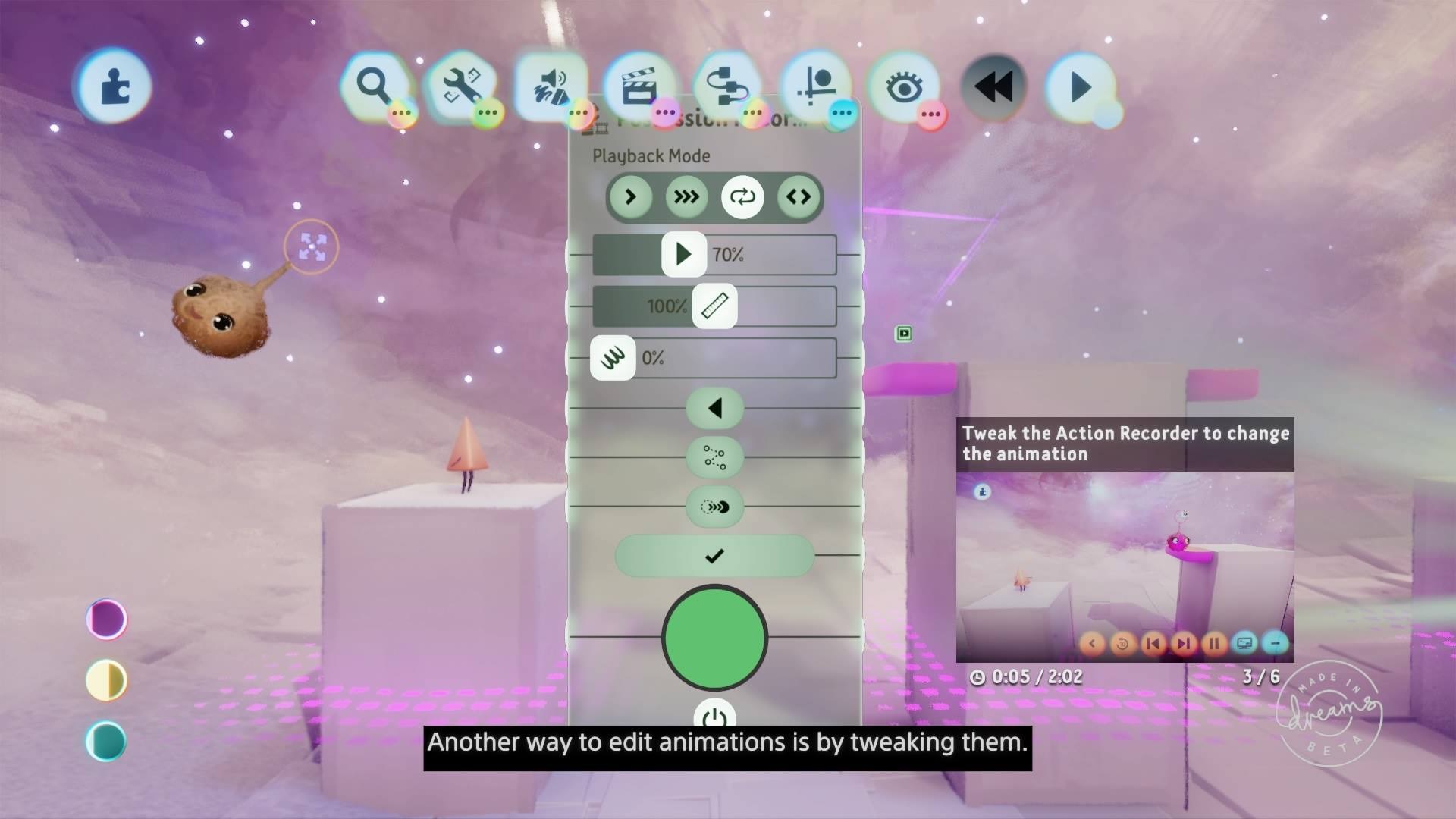 Testing out your work couldn’t be simpler, either. You can instantly enter ‘Play Mode’ through the pause menu, which brings everything to life. If you need to check a character can jump a gap then just play that section. If it doesn’t work, just go back and rewind the tutorial back to where you went wrong. This feels lightyears ahead of the groundwork established in LittleBigPlanet, a game of comparatively slight ambition. I remember slugging through those tutorials with an ever-depreciating desire to create. Dreams’ tutorials left me raring to go and feeling like anything was possible.