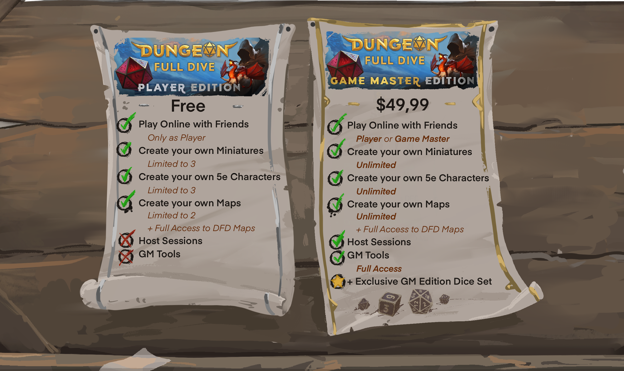 The 'Game Master Edition' lets you host sessions for other players and grants full access to the toolkit. You can create an unlimited number of characters, maps and miniatures, while all owners will receive an exclusive GM Edition dice set. Anyone who already owns the original version of Dungeon Full Dive on Steam will be automatically upgraded to the GM edition "at no additional cost."