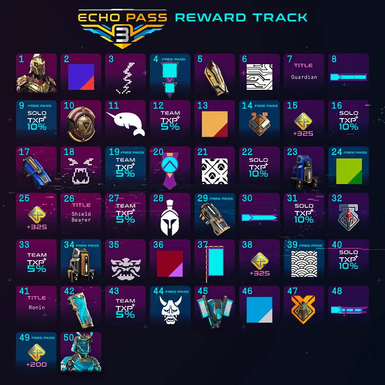 Echo Pass Premium is available for 1,000 in-game credits, or ‘Echo Points’, which amounts to roughly $10 USD. Oculus says that the 50 rewards include “fresh customization items, heraldry, personal Tier Experience Point (TXP) boosts, group TXP boost, and Echo Points.” You can take a closer look at the reward progression in the image below.