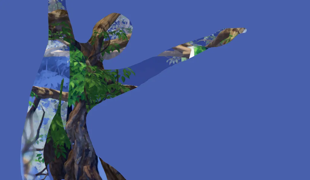 In one of several scenes that are part of Embody, the player sees colorful petals floating all around above the ground. There’s a transparent outline of a human stepping forward and simultaneously raising both arms above the head.