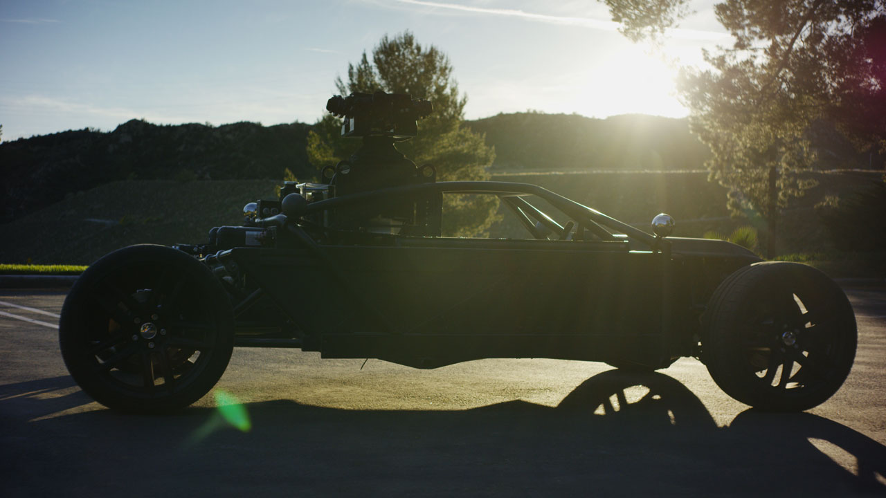 These virtual vehicles were super-imposed on top of the Blackbird during a live action shoot on the Angeles Crest Highway in Los Angeles. The Blackbird uses professional grade AR, filming a 360 video from the center of the vehicle using Red Epic cameras. Everything that’s around the vehicle is filmed as if it was a panoramic 360 photography. And a spinning LiDAR scanner is scanning the surrounding environment.