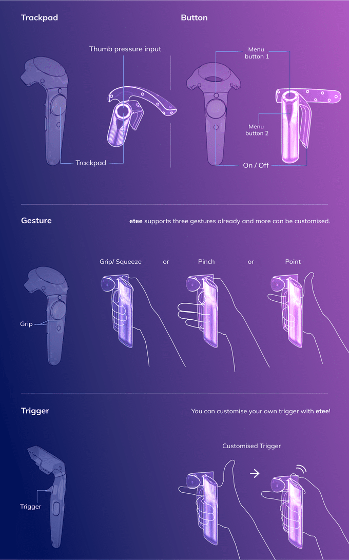 The etee controllers should ship with software tools for developers to use and, according to the group behind the project, they will include “the ability to bind etee finger sensing and other control surface inputs to those of traditional SteamVR controls via the embedded SteamVR UI” and they say etee can “connect to the full range of SteamVR games and applications that are already available.”
