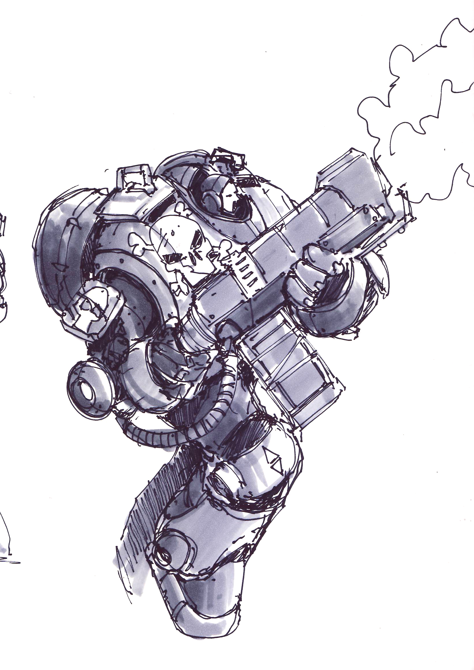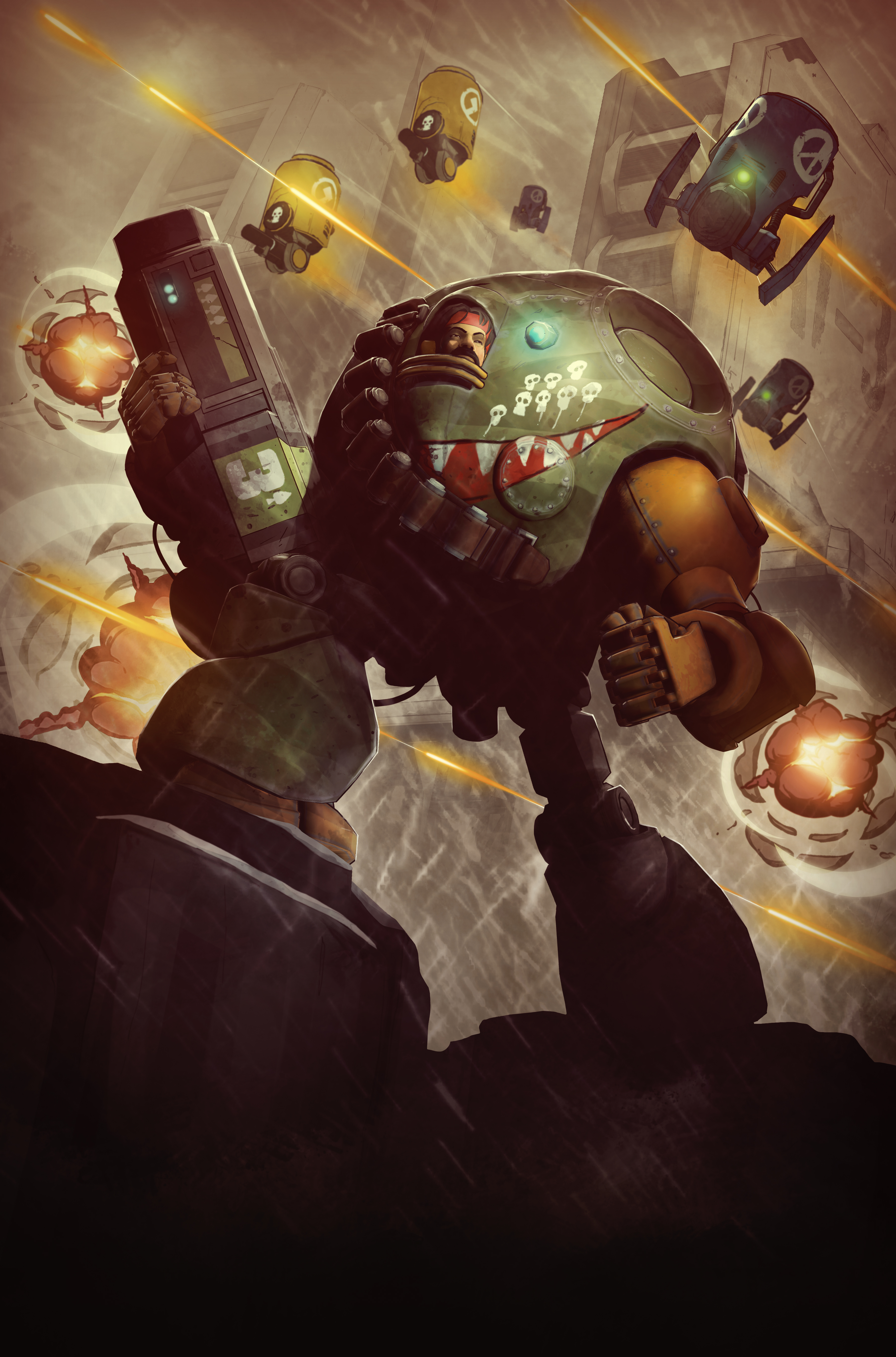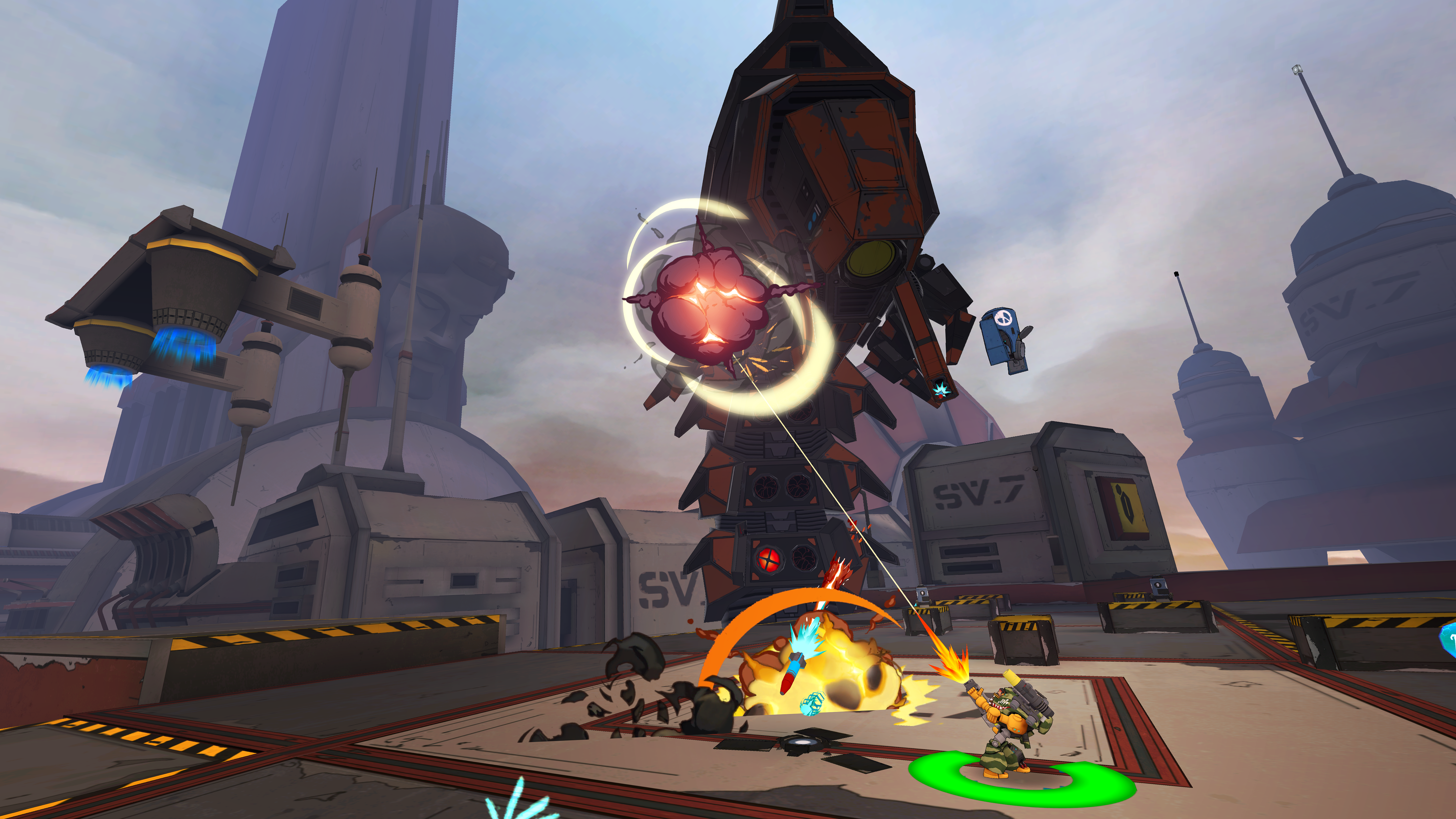 In Gun Sight, you play as Colonel Jack ‘Knife’ Denvers, a space marine-esque action hero lifted straight from the 80’s (the team say if he was a movie star he’d be in the cast of The Expendables). He wears a big, hulking battle suit, spouting grizzly one-liners as he tears through a galaxy-wide robot invasion.