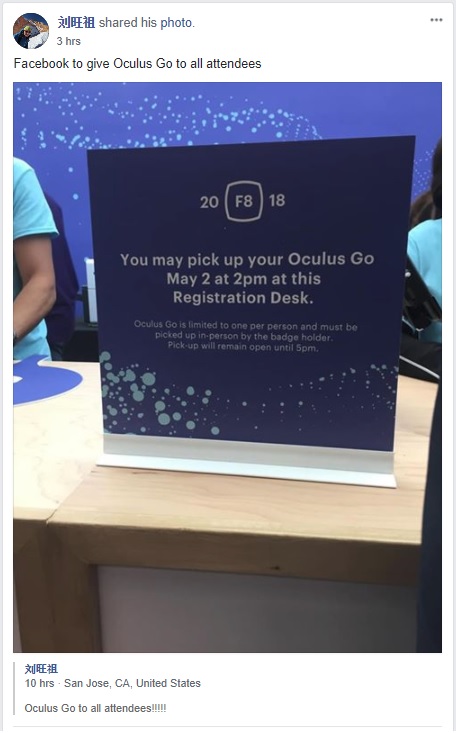 An image, supposedly taken from this year’s show, popped up on a public VR group on Facebook a few hours ago. The picture includes a sign informing attendees that they can pick up their own Oculus Go unit at the registration desk later today. That seems to confirm that either Mark Zuckerberg or another Facebook executive will announce that every F8 attendee will be getting a free Go during the keynote speech set to take place at 10am PST today.