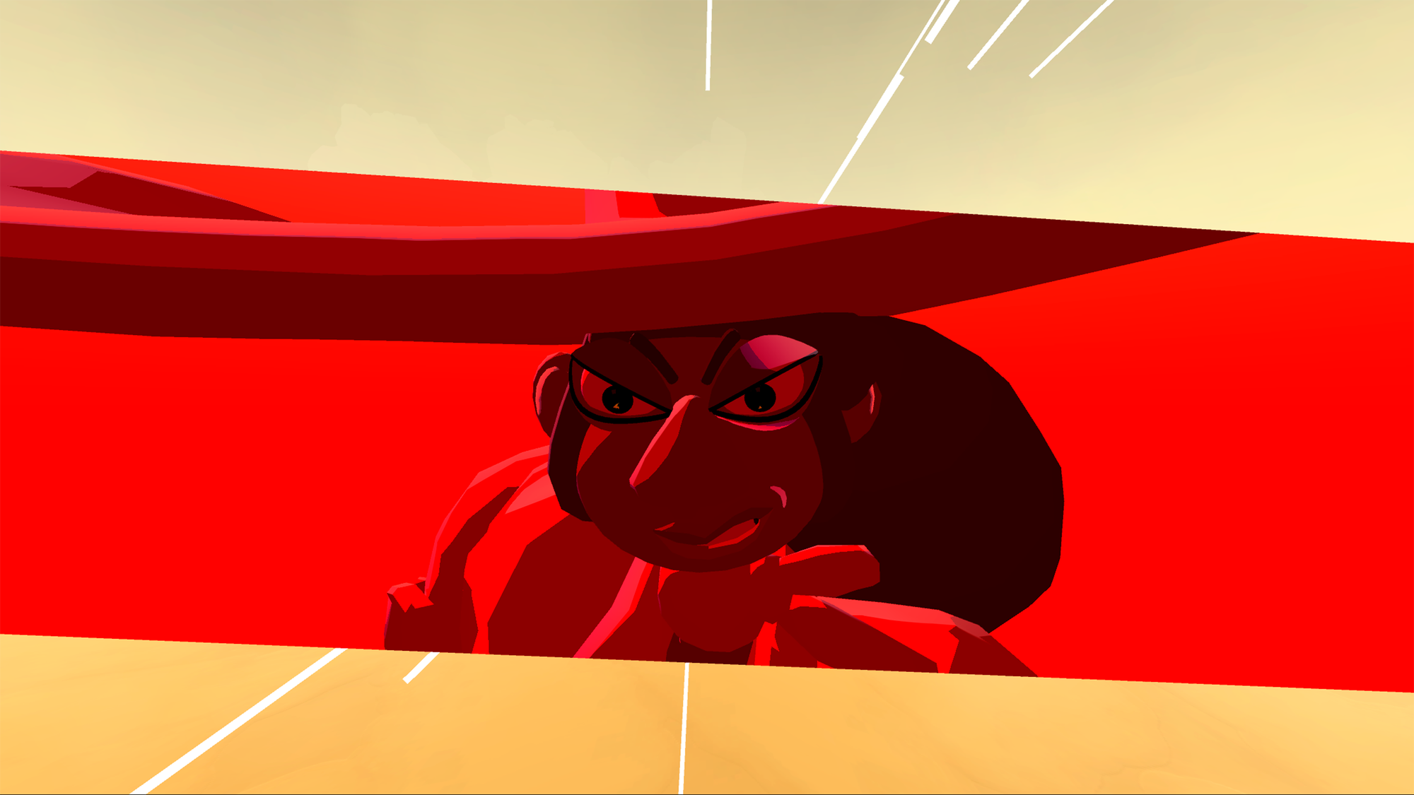 Some scenes are a little more intense than others. Your journey begins with a three-way standoff in the Wild West and meeting someone's gaze brings up this big red background, which is followed by an initially jarring perspective shift. Another scene takes the more comical approach by letting you throw sets of eyes onto inanimate objects; it's all very strange and rather funny.
