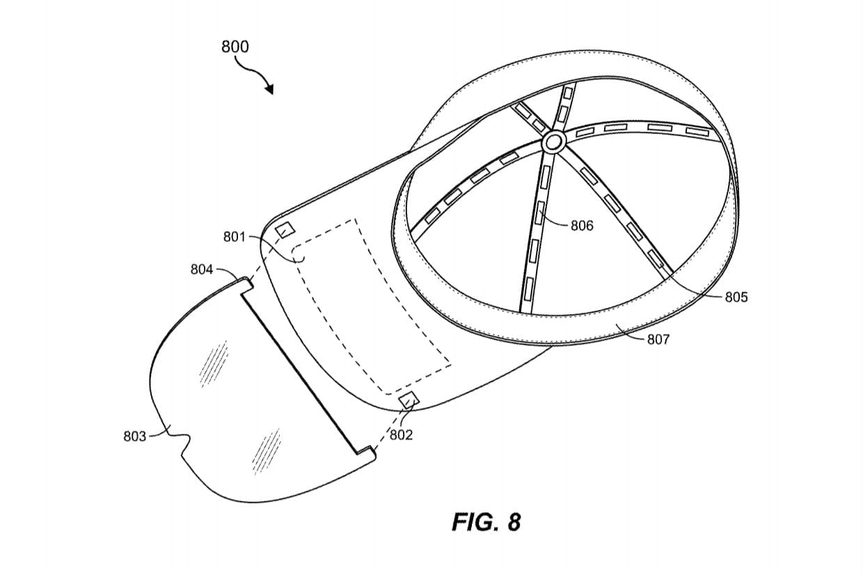 Images in the filing (first filed in 2019 and originally spotted by Founders Legal) depict a visor that attaches to the front of a cap and dangles in front of the user’s eyes. But it’s not just caps – images also show the solution attached to fedoras and other headwear. There’s even drawings of the concept in use with finger-tracking gloves and what looks like the CTRL-Labs wristband that Facebook acquired in 2019.