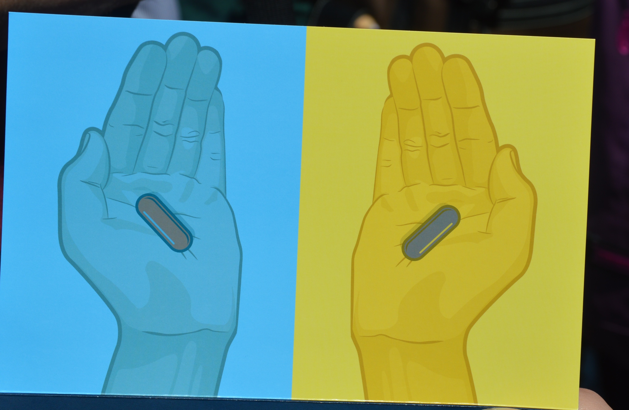 Attendees were then instructed to open their envelopes for a series of demonstrations of various optical illusions demonstrating the fungible nature of our reality. One of the items was a card with two sections, each featuring a hand holding a pill – clearly a reference to the “red pill” and “blue pill” from The Matrix. Similar to the famous/infamous picture of “the dress”, it showed the subjective nature of visual perception. While the hand with the yellow background appeared to hold a much darker pill, the two pills were actually exactly the same color.