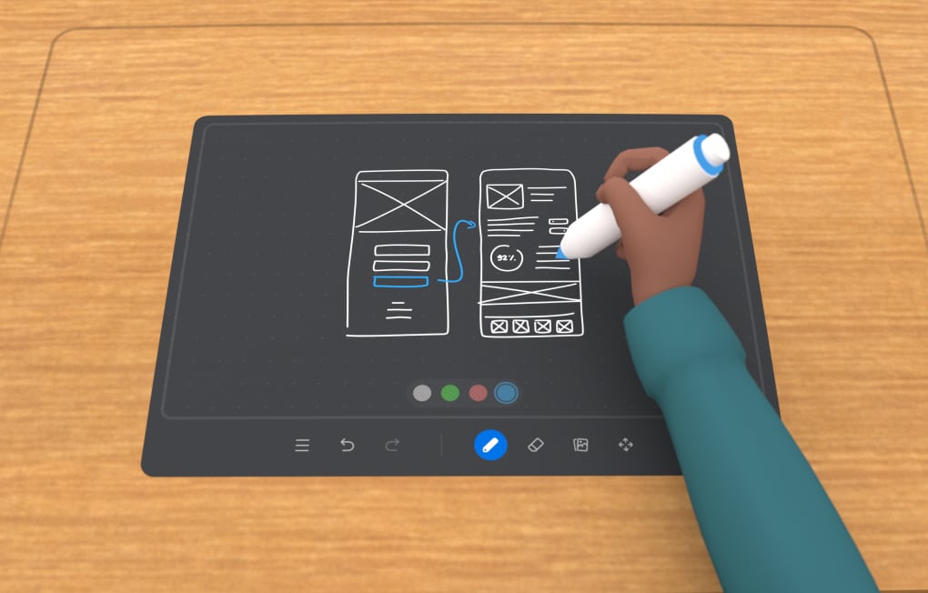 Horizon Workrooms is Facebook’s first software built from the ground up for controller-free hand tracking, and it is also the first released to headset owners to use their physical surroundings for added functionality. For example, the creators of the service include a whiteboard writing feature that flips an Oculus Touch controller around, so holding the base like a pen turns it into a writing instrument when pressed against a physical desk. Facebook calls this “mixed reality,” with the desk’s physical surface and keyboard either visible in a passthrough view from the headset’s cameras or re-skinned with virtual content.