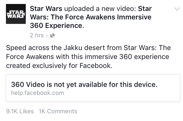 Facebook is joining Youtube in support for 360 videos directly on its site and apps. Initial partners sharing panoramic footage include Star Wars, Discovery, GoPro, LeBron James & Uninterrupted, NBC’s Saturday Night Live, and VICE. For example, there’s a Star Wars video available of a craft speeding across the desert you can watch on the Facebook page for Star Wars linked above.