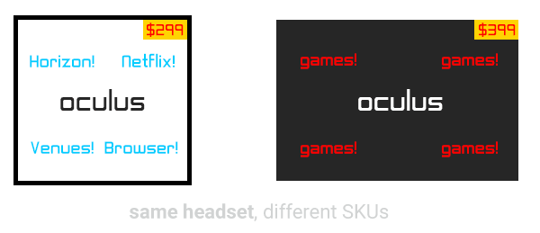 How would this look in market? One SKU would be a fairly neutral box without controllers. On the outside of the box, and in the Amazon listing, would be a list of social VR apps alongside Netflix, Oculus Venues, multi-window Browser, and casual games with support for hand tracking.