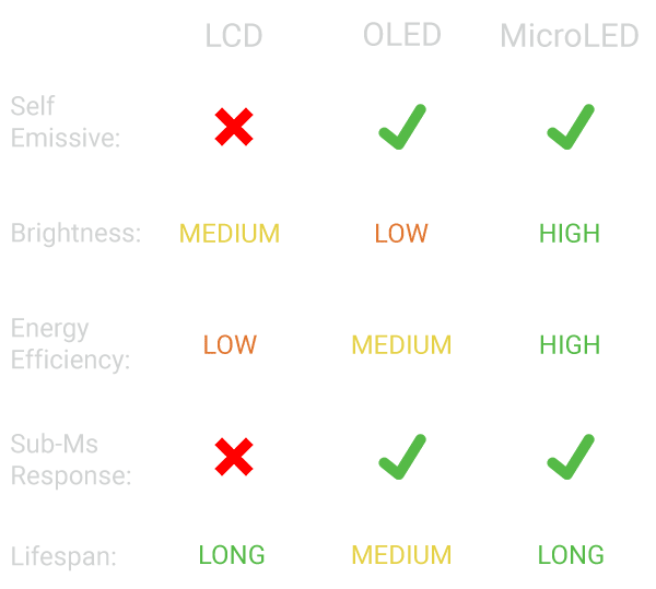 MicroLED is self-emissive like OLED, but should be orders of magnitude brighter than OLED, as well as significantly more power efficient. This makes them uniquely suitable for consumer AR glasses, which need to be usable even on sunny days yet powered by a small and light battery.