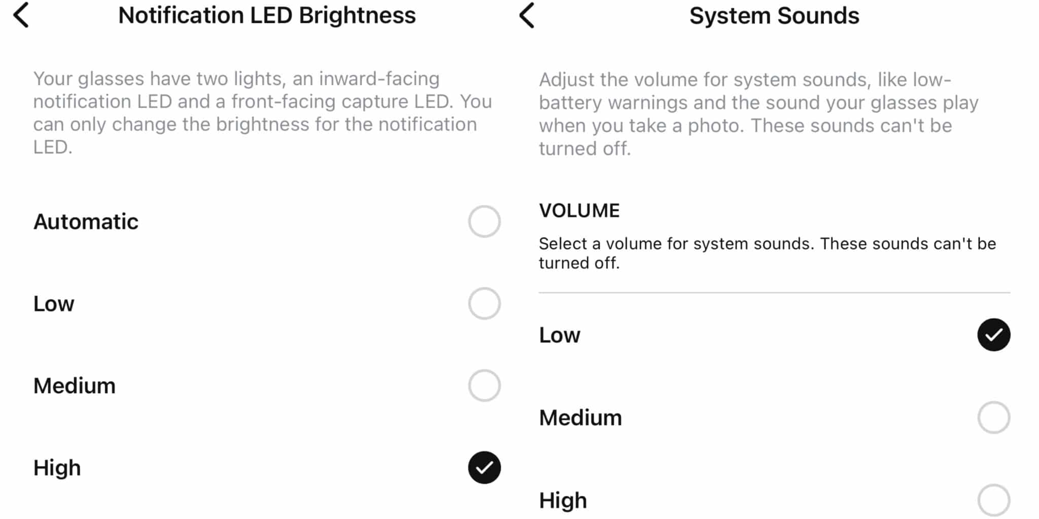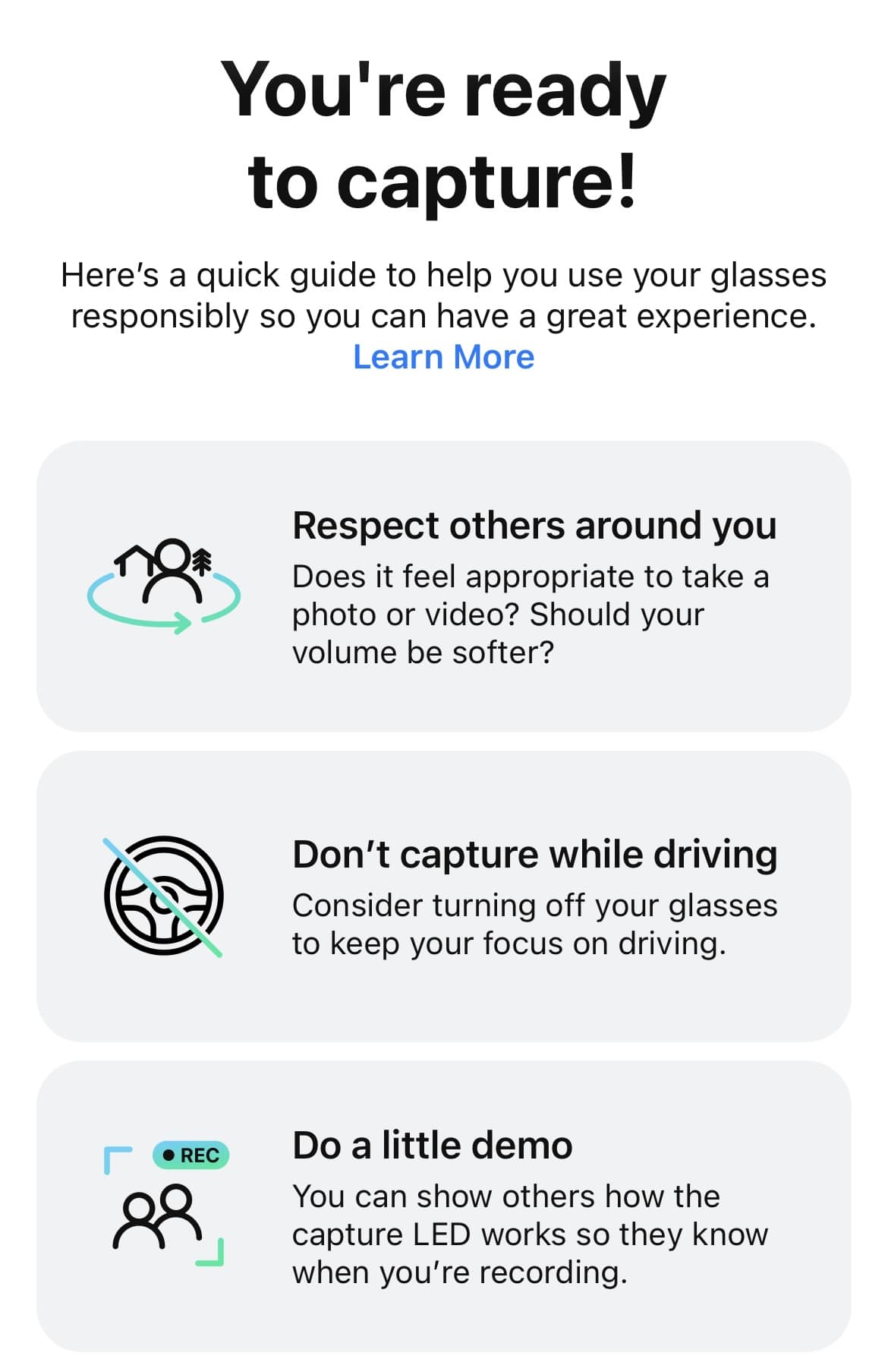 In the setup for the Facebook View app a dialog explained optional data sharing with “time spent taking videos”, “average length of videos captured”, and “number of images captured” as examples of what’s collected. That information could help paint of picture of the battery and storage requirements needed in future designs.