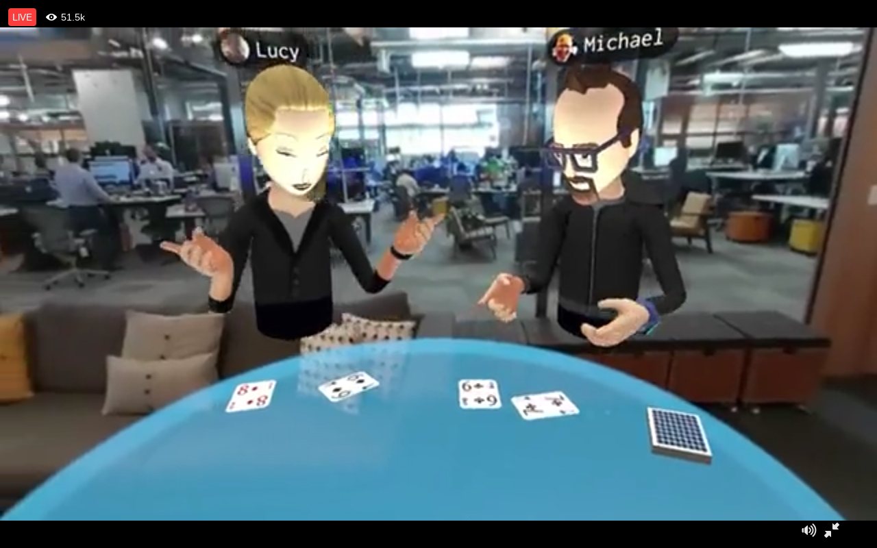 Impressively detailed avatars met in 360 degree environments, their facial animations would change based on the expression in their voice and they could travel to other destinations. Riffing somewhat on the Oculus Toybox demo, they’d play with cards and even used magic marker-style pens to draw swords which they could then hold and pretend to fight with.