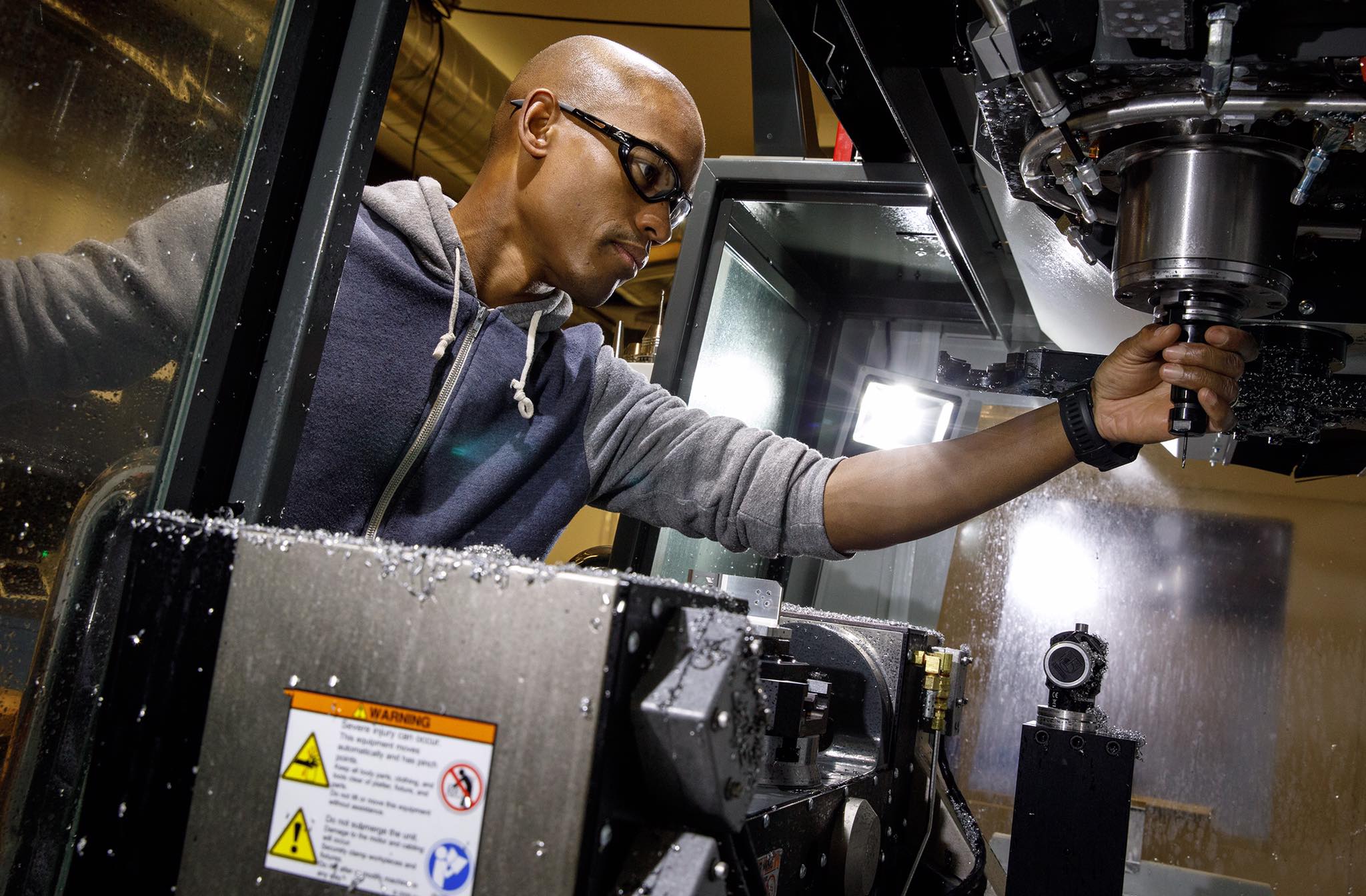 “We’ve built labs that let us quickly make new kinds of lenses and devices to push the boundaries of virtual and augmented reality. The includes a Diamond Turning Lab that cuts metal with a gemstone quality diamond, and this 5-axis CNC milling machine,” his caption on the below photo reads.
