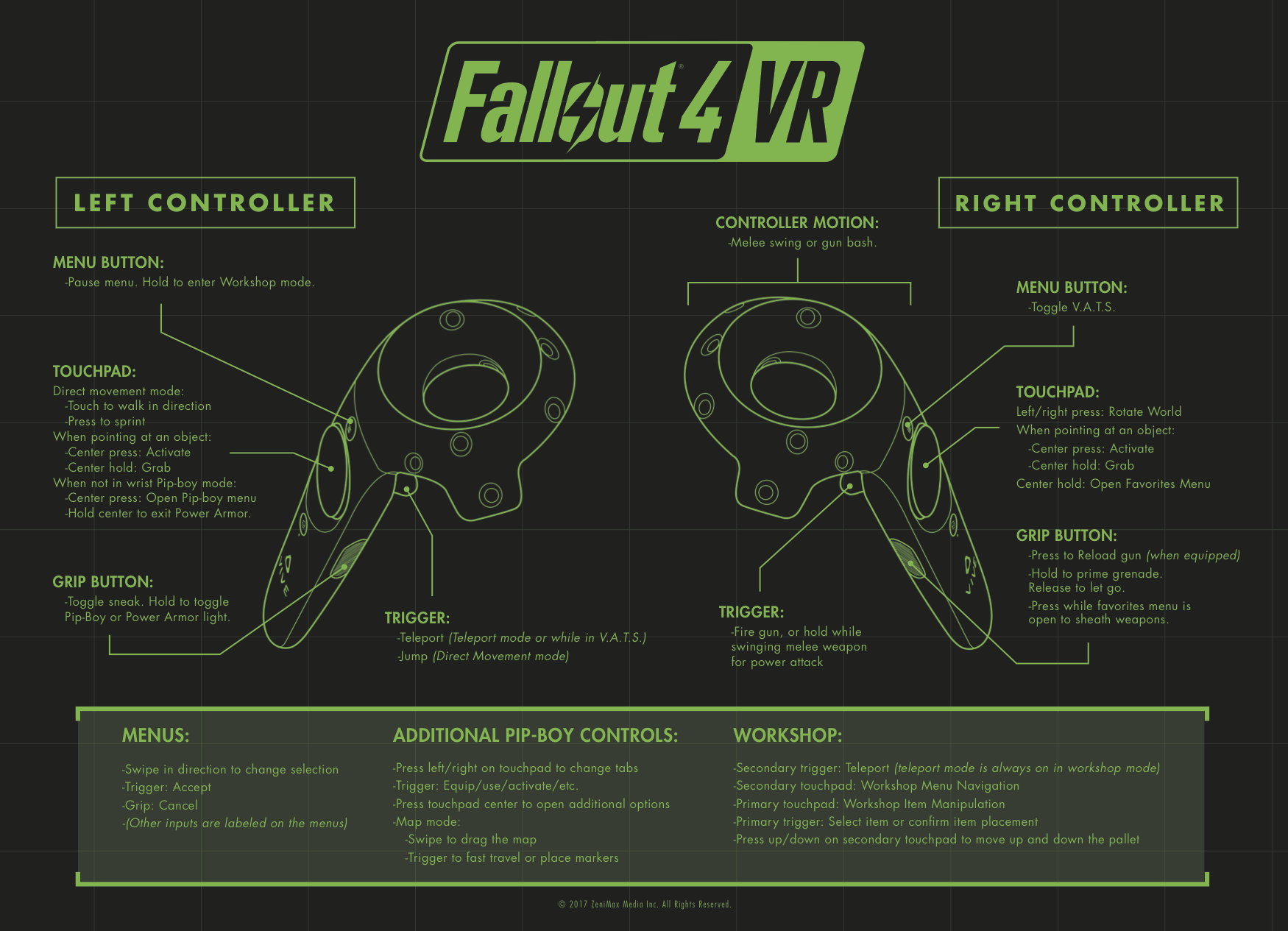 The first thing you have to understand about Fallout 4 is that it was built specifically for the Vive head-mounted display (HMD) and accompanying Vive controllers. While a gamepad will register some button presses and trigger pulls, the analog sticks don’t move you and your hands don’t register in space when using a gamepad, so unless you’re content with standing in the same spot for hours waiting for enemies to slide up under your stationary gun before you take a shot, you’re not going to get much out of trying to play that way…you have to use motion controllers. Don’t get me wrong, I prefer to play virtual reality games with full motion controls, but in a game as big as Fallout I was left wanting for a gamepad option on occasion simply because of fatigue issues after playing for hours.