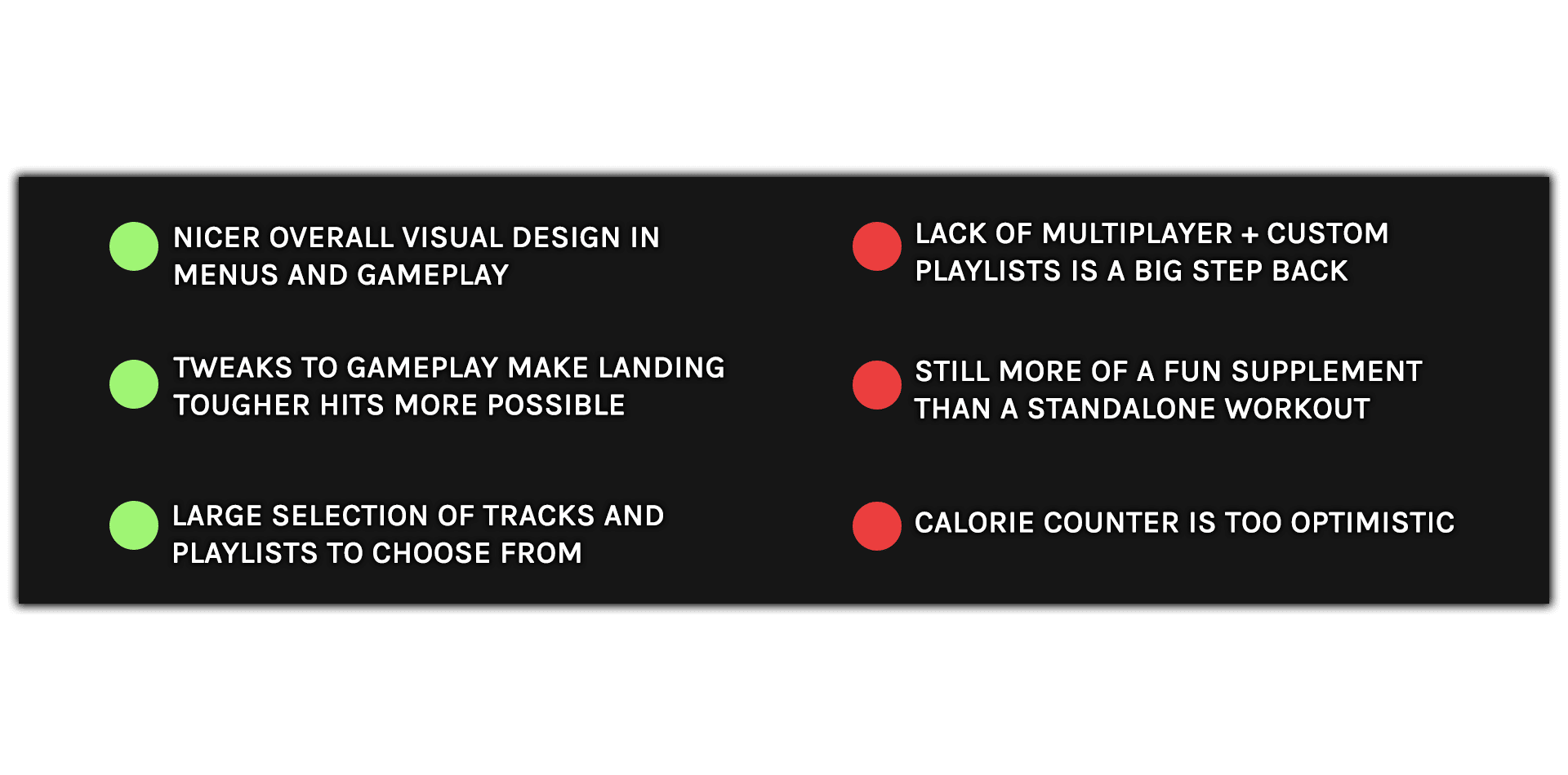 Also gone is the option to make custom playlists. BoxVR never had the most compelling tracklist, but the ability to create a workout to match your tempo was one of the game’s most welcome features, and its removal is truly confusing.