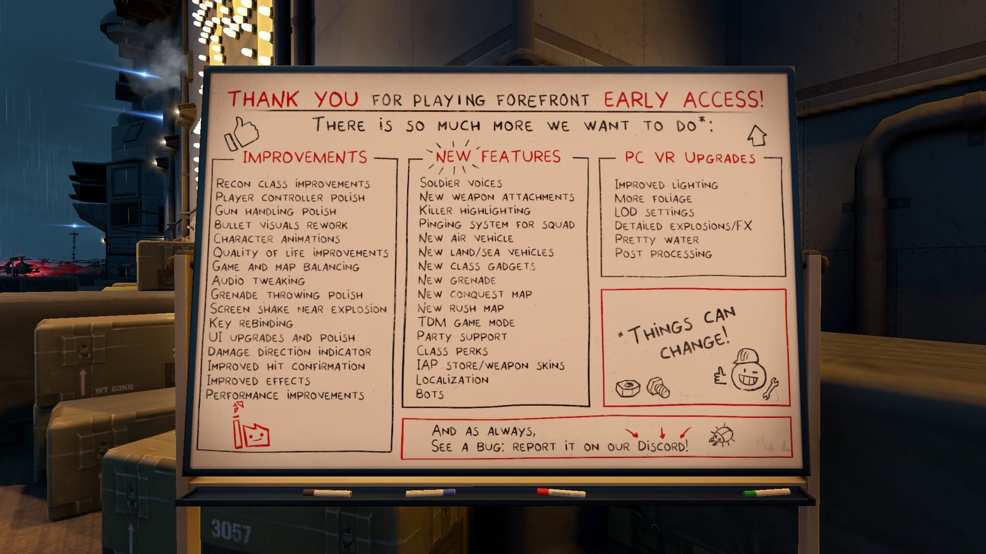 Detailing its release plans in a Steam FAQ, Triangle Factory states that Forefront will approximately remain in Early Access for "8-12 months." Planned additions for the full release include more maps, vehicles, and gadgets, joined by class perks, performance improvements. Updated PC VR graphics are also mentioned, and the studio plans to "gradually raise the price" as new content gets introduced.