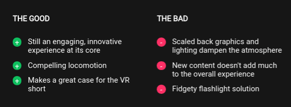 The original version of Freediver: Triton Down overcame the odds to deliver an effective piece of claustrophobic VR. Some unavoidable concessions hold this Extended Cut back from being quite the same success story, hampering the original’s tone and atmosphere somewhat. Some of the new content goes a little way to making up for that, though not so far as to make this the best version of the game. You should still play Freediver but, if you have a PC powerful enough, take the age old lesson: less is more.