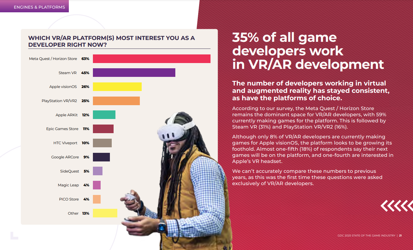 One studio told UploadVR lower than expected sales on Quest means they'll be focusing on multiplatform launches in the future, naming Steam as a certainty, while PS VR2 and Android XR are “maybe.” GDC's State of the Industry report, which surveyed 3500 developers, advised 59% of VR developers are working on Quest/Horizon games, 31% for SteamVR, 16% for PS VR2, and 8% for Apple visionOS.