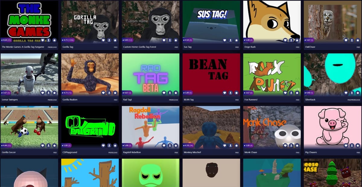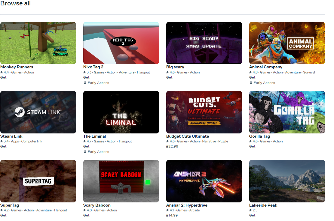 But it is not long before you reach the 'Browse All' category, where listed entries often have some variation on the words “Gorilla,” “Tag” or “monkey.” These often outrank Gorilla Tag itself due to inflated ratings from a small number of users. Many of those we spoke with view the Quest Store's current discoverability poorly, and worse than Steam. One developer likened it to entering a department store filled with cheap clothes during the holidays.