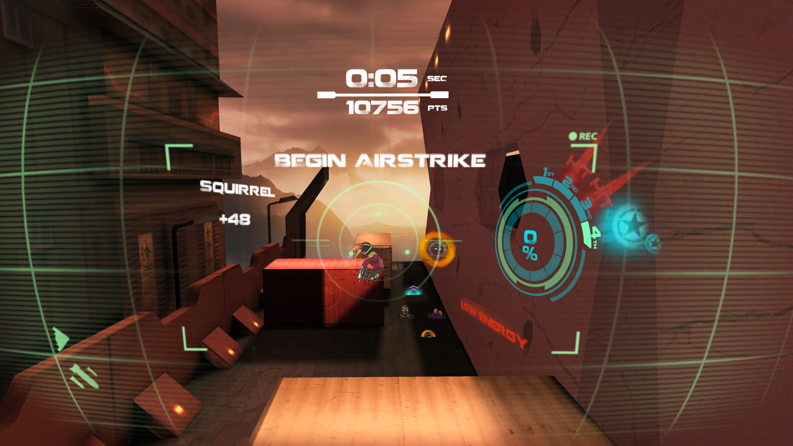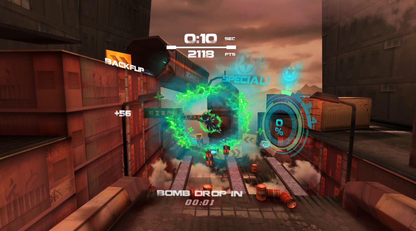 It wasn’t all smooth sailing, however. One big technical obstacle they tackled in development was the strain of rendering particle systems. For those not familiar with the term, a particle system is a technique that uses a large number of very small 3D models and other graphic objects to simulate “fuzzy” or chaotic phenomena such as explosions, smoke, and abstract visual effects. As a workaround they created a frame-by-frame animation of this particle system that they were then able to use throughout the game without compromising on the visuals. They also developed an AI system that tracks the user progress so that the pursuing bots never get too far ahead or behind the player, keeping a constant competitive edge.