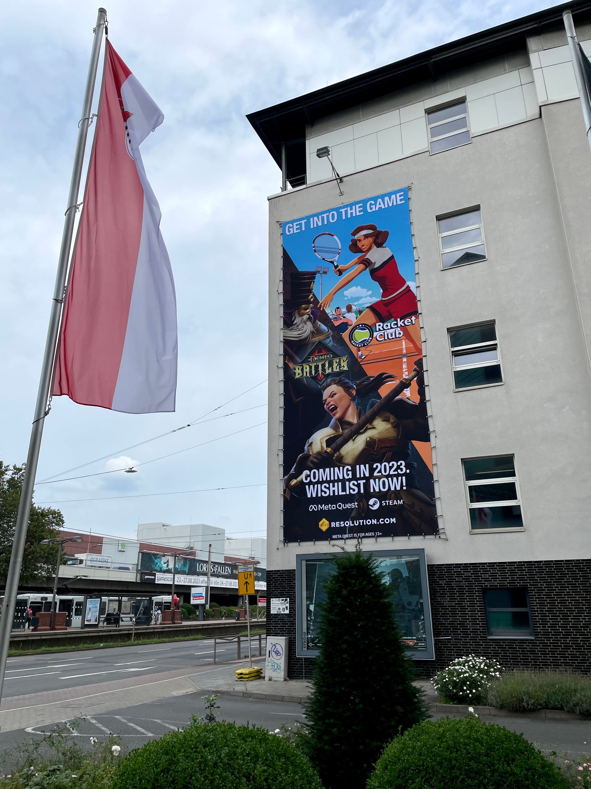 This year, there was relatively little public-facing VR or AR-focused experiences and booths. Neither Meta nor Pico had any presence in the public halls this year. Resolution didn't return to the show floor for 2023, but at the very least they did have a large banner advertising Demeo Battles and Racket Club outside the West entrance to the Koelnmesse, pictured below. A nice touch – but a shame there wasn't the opportunity to demo either game on the show floor. Demos of 1v1 Battles matches would have been an especially great shout ahead of the game's November launch.