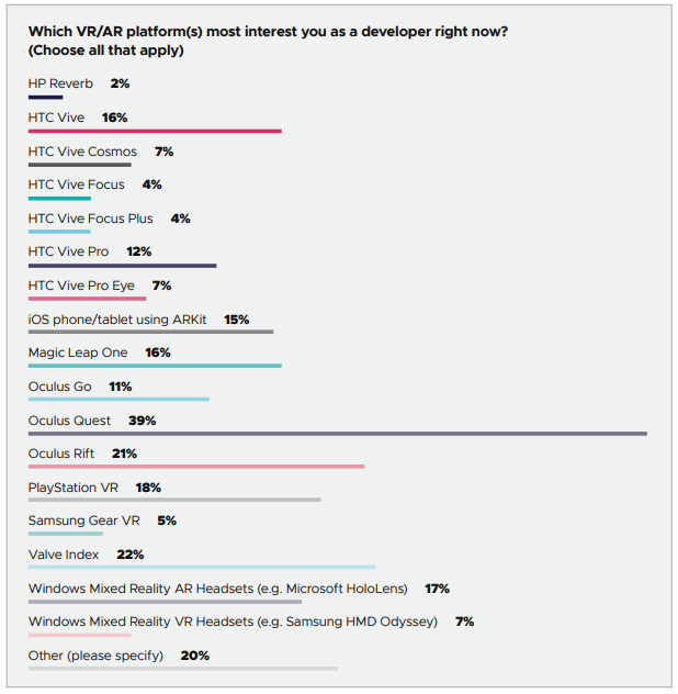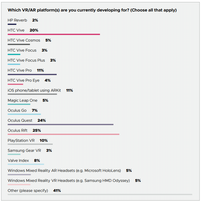 Another notable question on the 2020 survey is more specific in asking “Which VR/AR platform(s) are you currently developing for? (Choose all that apply)” and that question narrows the gap between HTC Vive at 20 percent while Oculus Rift and Oculus Quest lead the pack at 25 percent and 24 percent, respectively.