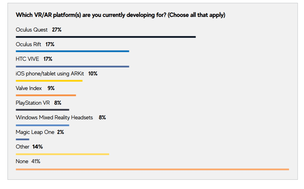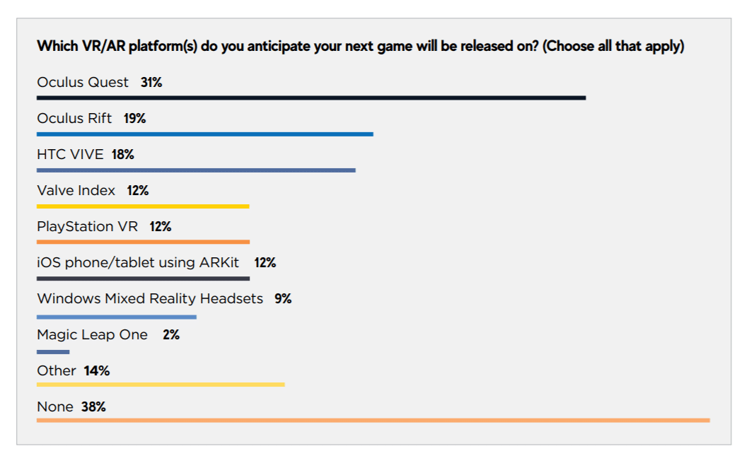 The report does turn its attention to VR, though, and suggests that Facebook’s Oculus Quest is the primary source of interest in the industry right now. 52% of responses said that Quest was the VR platform that interested them the most, followed by PSVR and Index at 28% each. The graph doesn’t group SteamVR headsets together, instead listing Index, Vive and others as separate entities.