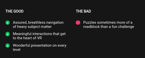 “It’s an experience in which emotional weight guides your each and every action, giving you reason to act beyond a simple state of failing and succeeding. It is at times delightful and at others unflinching, with moments of VR purity that tear down the barrier between you and your companion. If you want a look at where the true power of VR lies, look no further than Ghost Giant.”