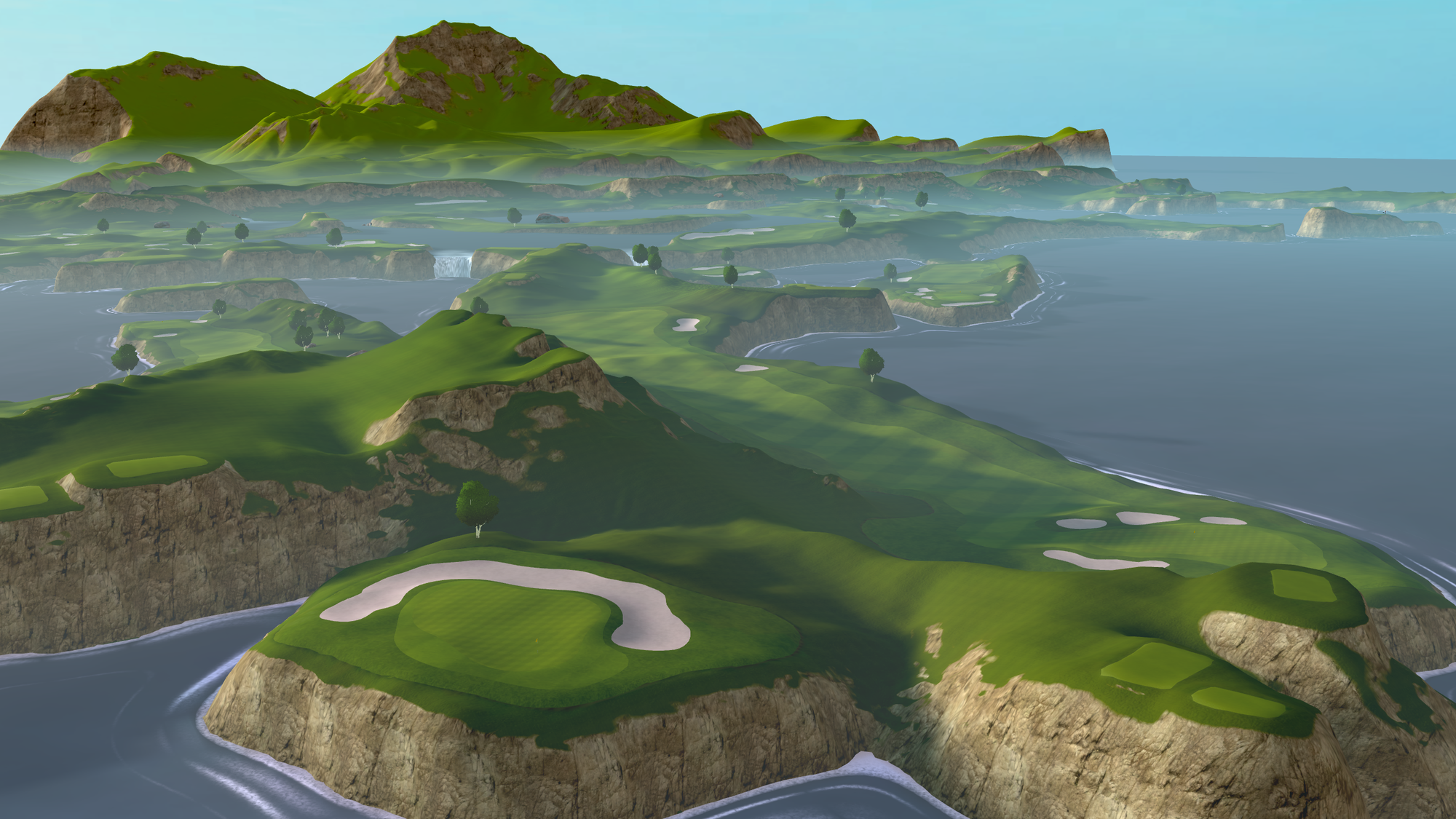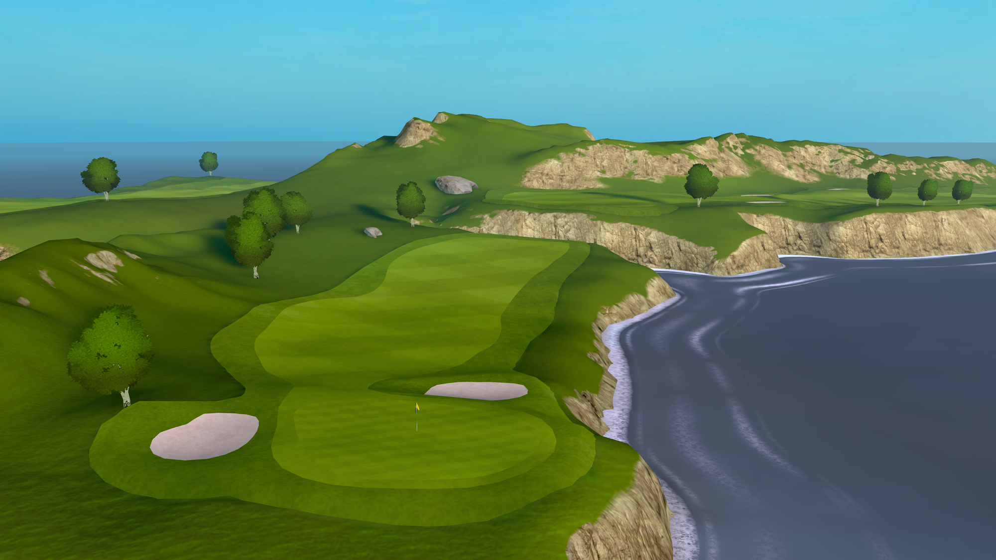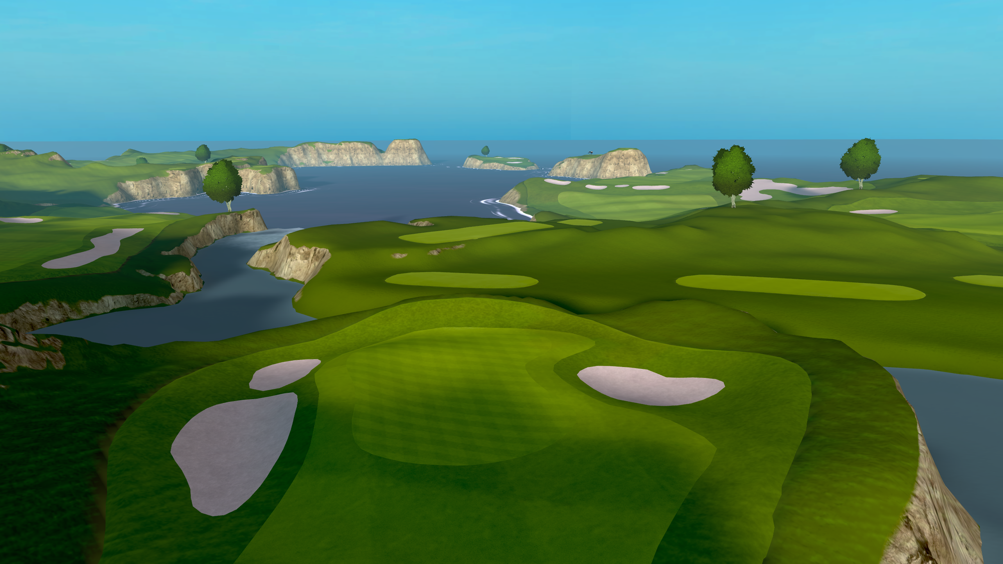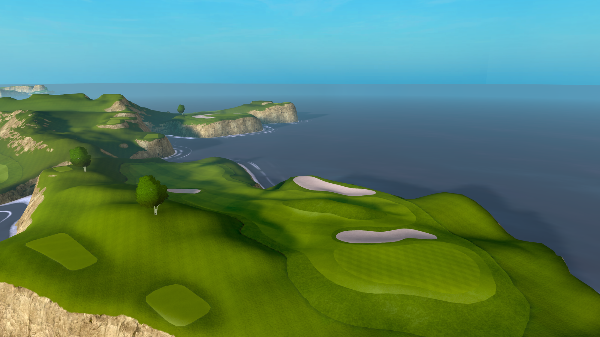 That 2021 release saw the game radically change from a putting-focused experience, with the only full-swing offering being a driving range, to full-swing golf. Cliffs was the game's first full course, "loosely" based on Roy Kizer Golf Course in Austin, Texas.