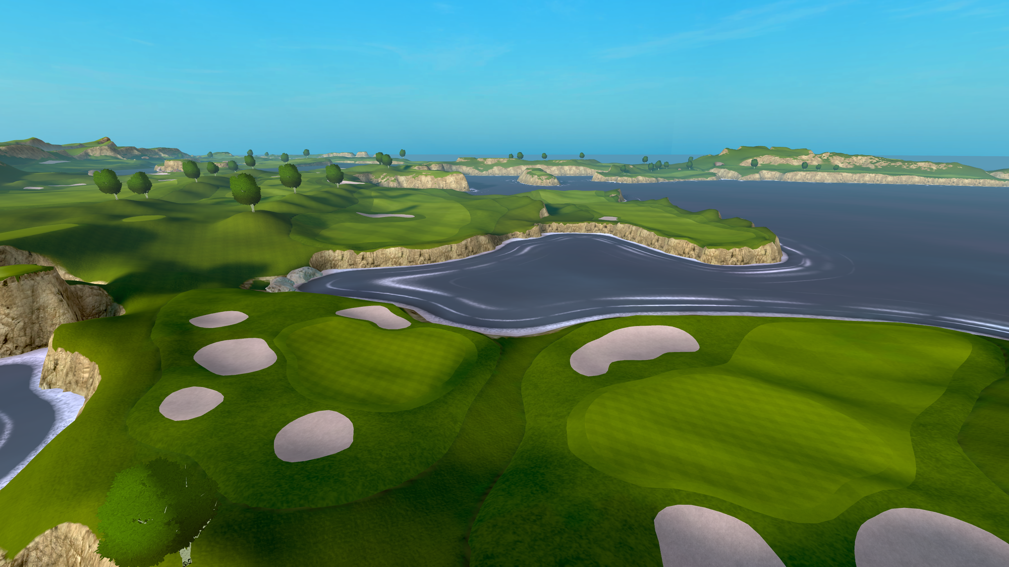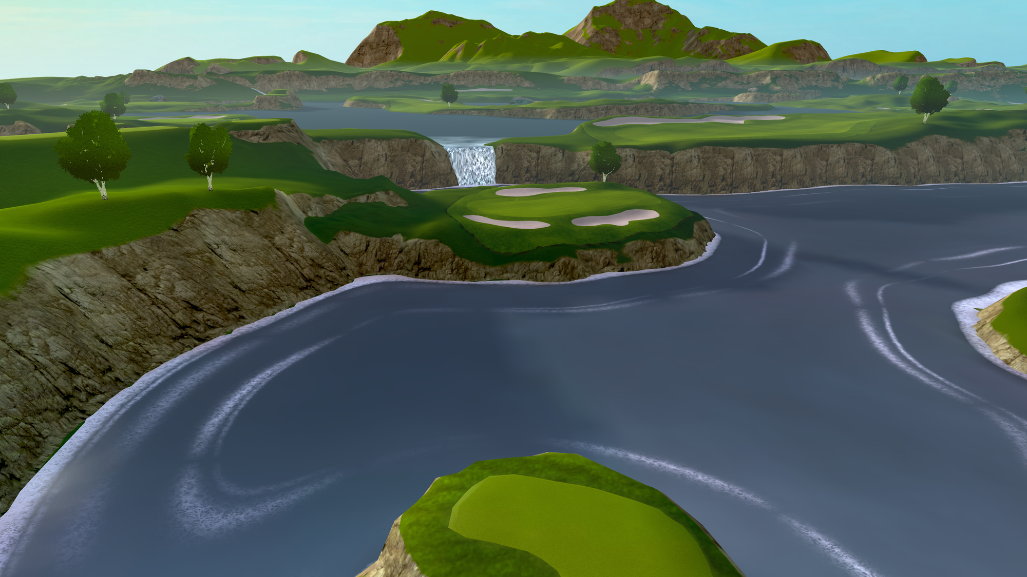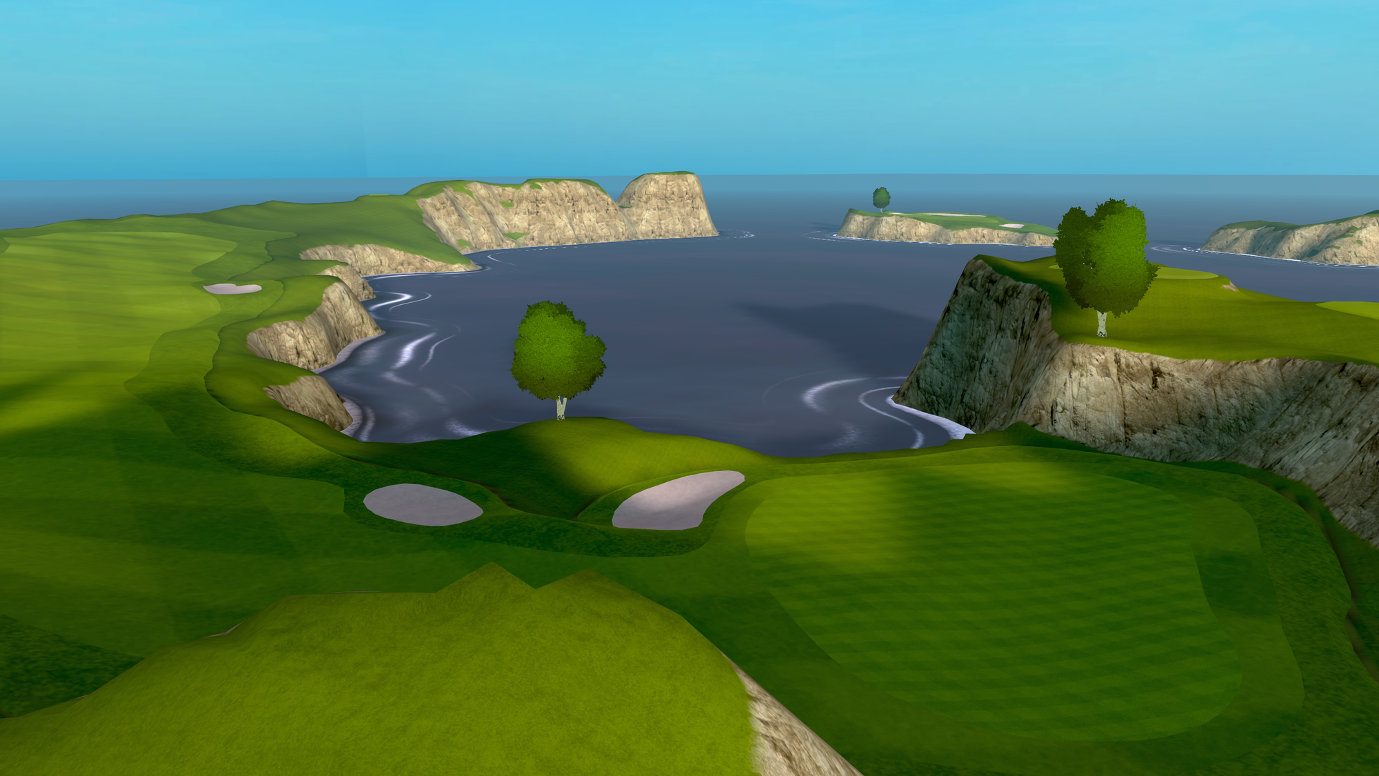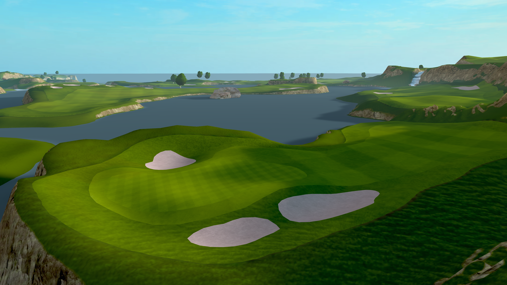 That 2021 release saw the game radically change from a putting-focused experience, with the only full-swing offering being a driving range, to full-swing golf. Cliffs was the game's first full course, "loosely" based on Roy Kizer Golf Course in Austin, Texas.