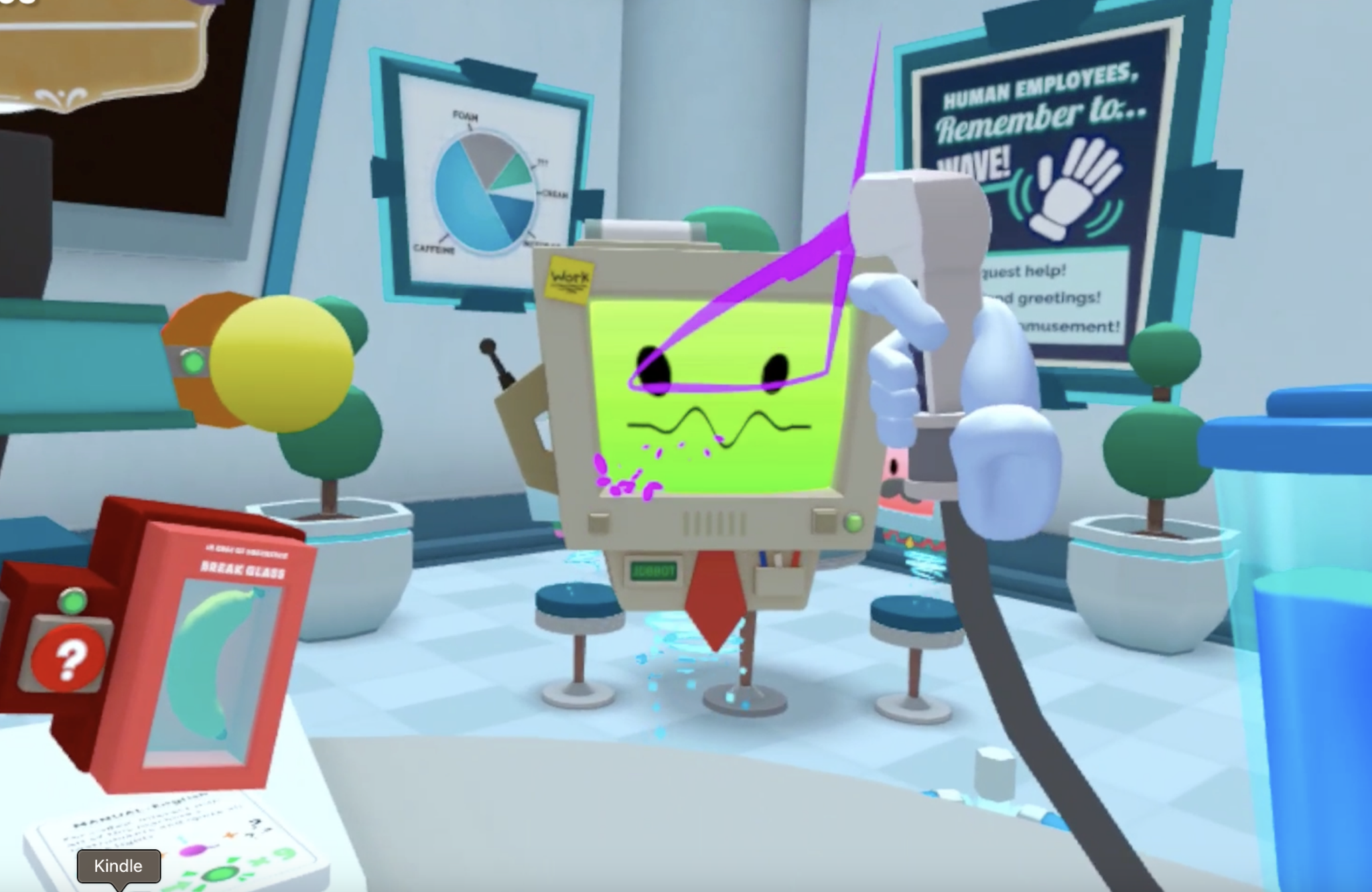 I passed objects back and forth between my hands, tossed them into the air and caught them, twisted dials, grabbed and used spray bottles and typed on a keyboard by pinching one floating letter at a time. I interacted with my squishy surroundings like a toddler at the daycare just like I have for the better part of the last decade in Owlchemy’s Job Simulator on every major VR system, including Vive, Rift, Quest, and PSVR.