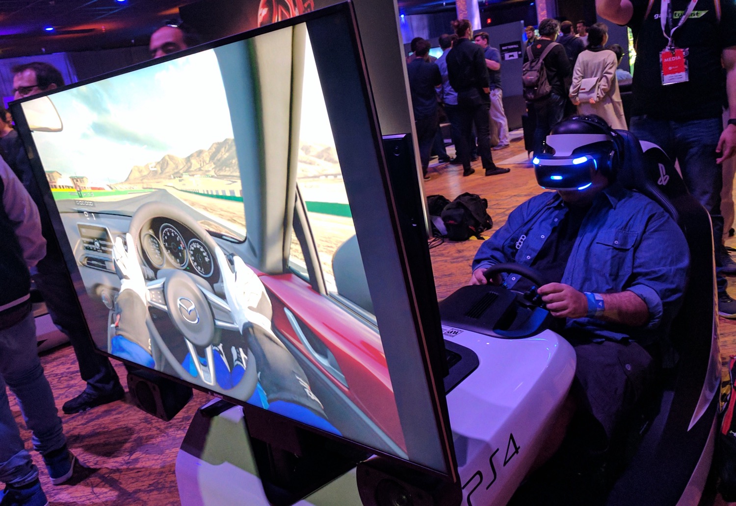 The setup at E3 was a full, single-driver cockpit with a high-end steering wheel and pedals.