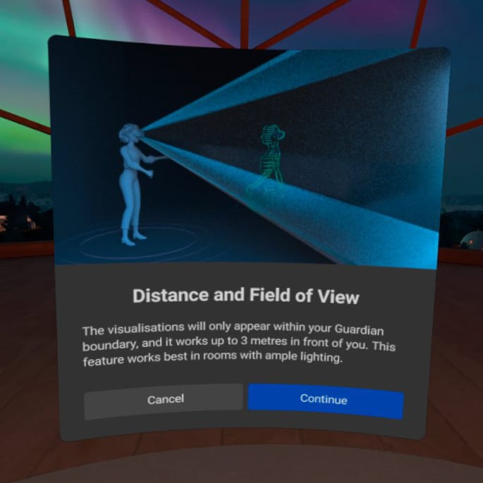 Quest headsets have cameras on the front and top sides, so the system warns you it won’t be able to see behind you, and “works best in rooms with ample lighting”.