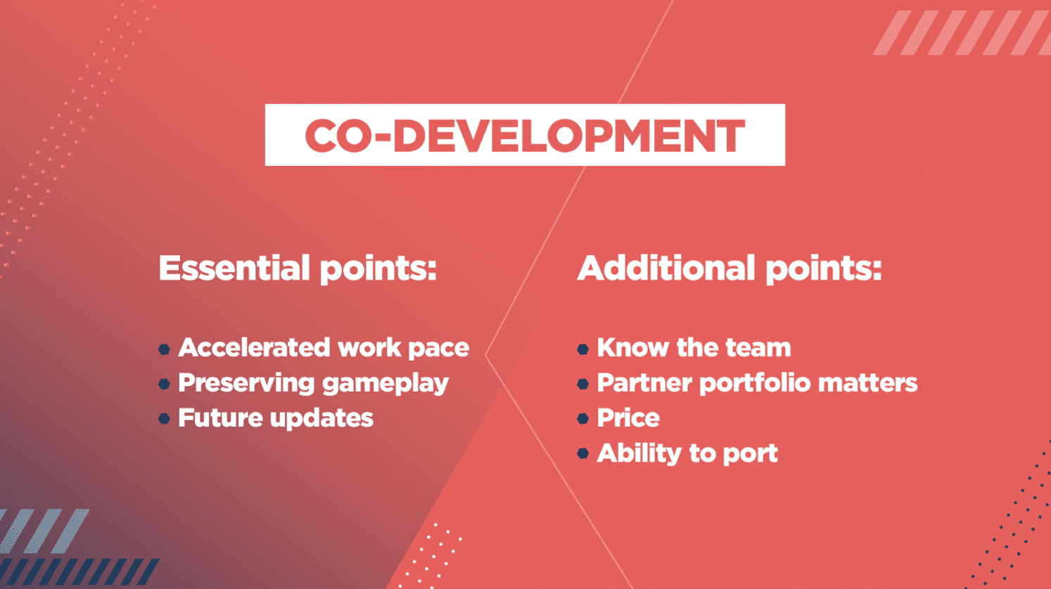- Co-development. A partner integrated into your work process with your internal team being heavily involved in the production process and calling the shots while the partner studio provides the missing expertise and human resources.
