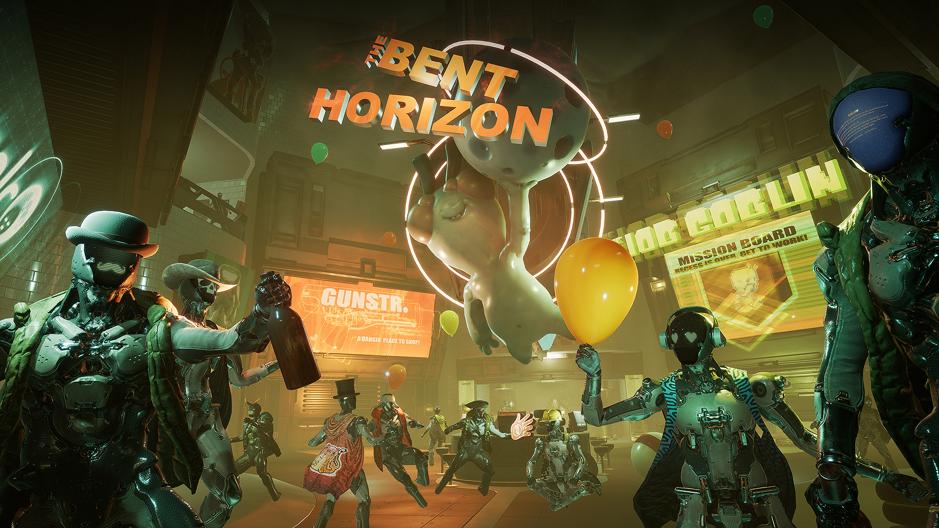 Each Bent Horizon instance also serves as a multiplayer hub lobby where other players materialize so you can chat and meet people and decide if you want to group up for some missions together. Having a physical (or rather, virtual) place to walk around and adjust things rather than just a bunch of menus really helps establish Gunheart’s personality and lore. It feels like a sci-fi version of Rec Room’s gym.