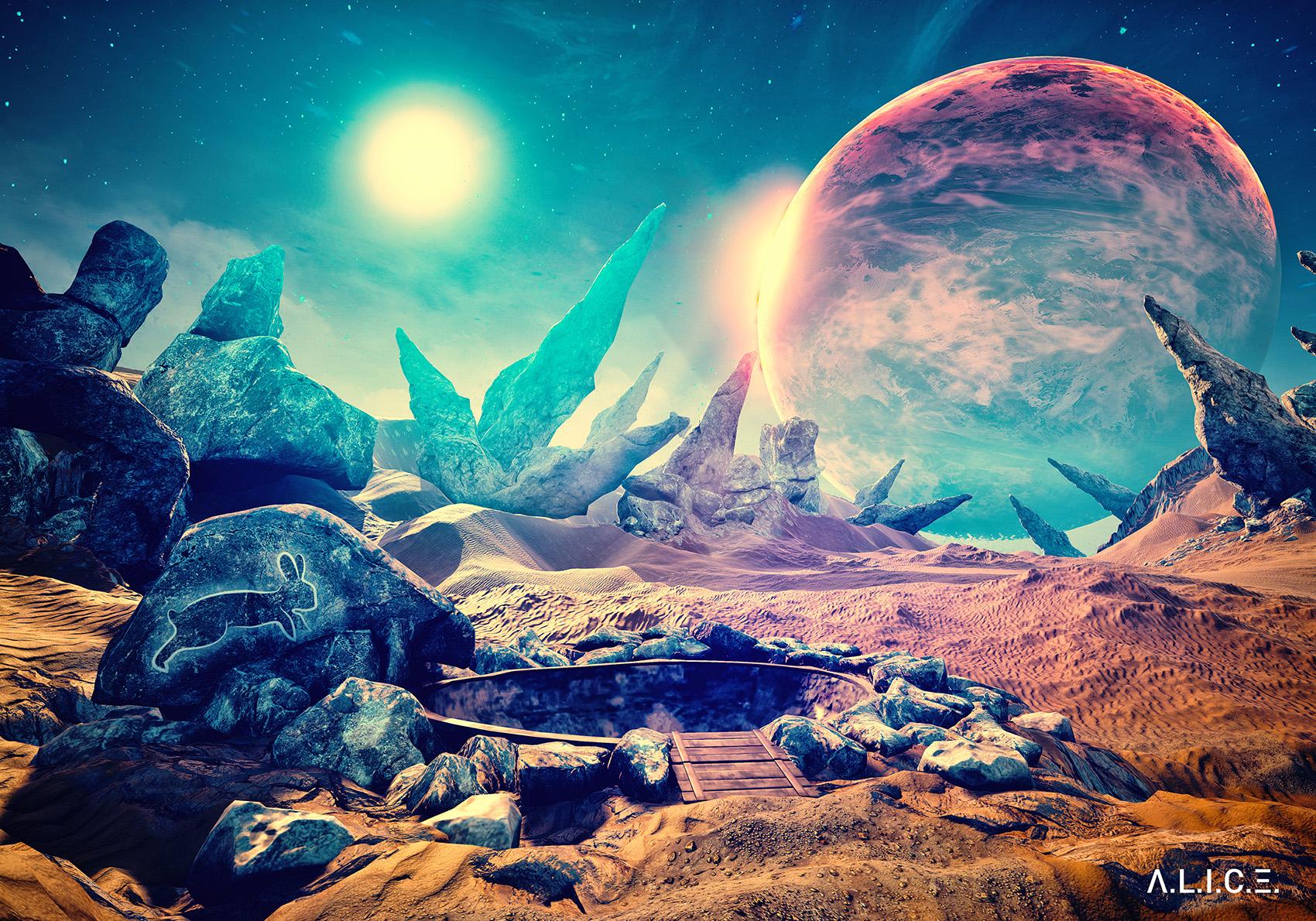 The first level was set in a desert environment that was quite something to look at. Having survived a crash landing on a strange alien planet (which I didn’t get to see myself) I slowly clambered through the barren wasteland, its brilliant orange rocks towering above me while a merciless sun beat down upon the scene. Up in the sky, I could seen another gigantic planet looming in the air, and I wondered what else I might find up there. It was clearly unintentional, but I was already getting a strong No Man’s Sky vibe from Alice VR.