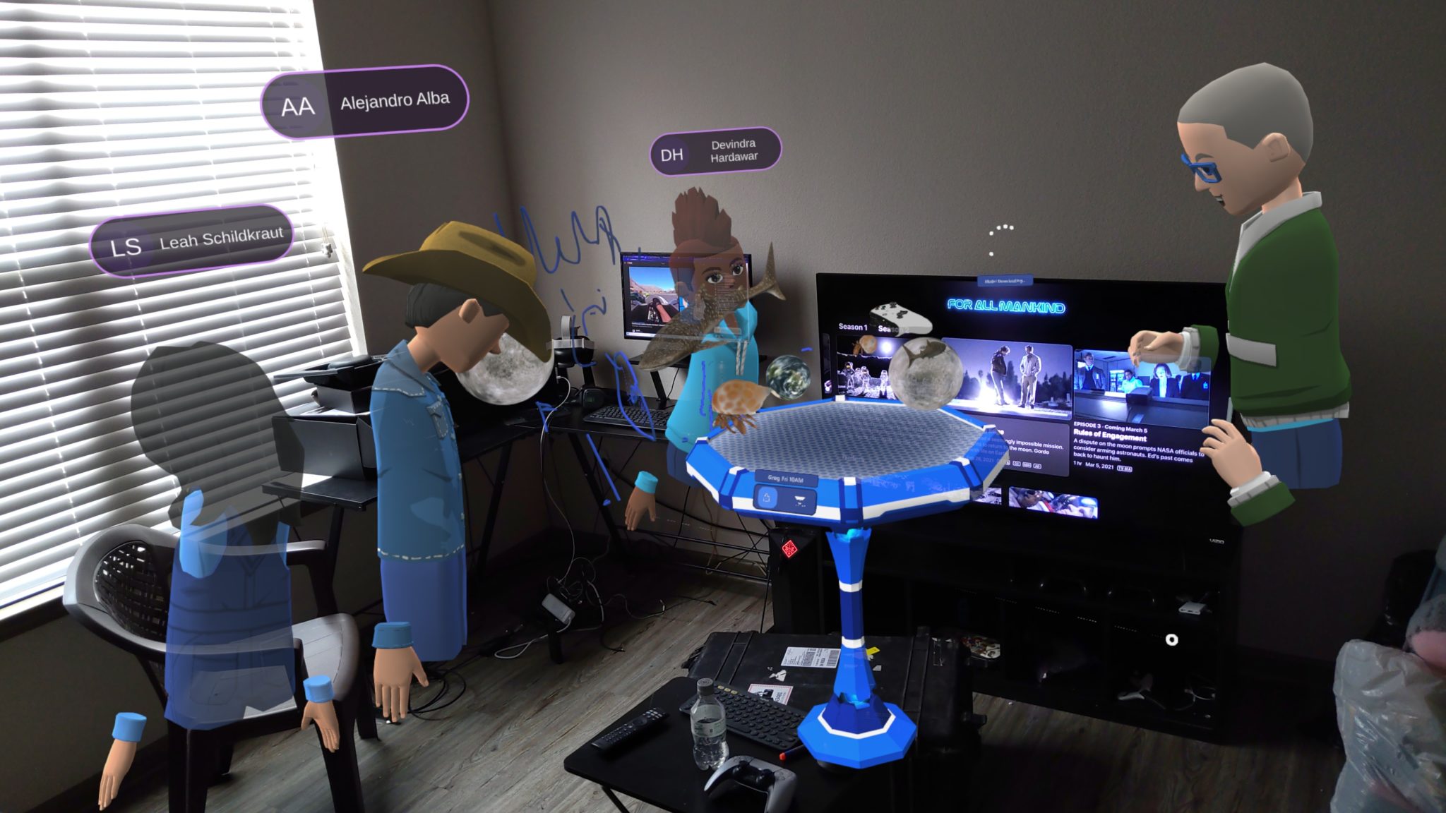 So, for example, I trialed a collaboration app named Fenix that came with many of the features you’ve come to expect from social VR apps. Along with other members of the press, I could import 3D assets into the space, pass them off to other users or pinch my fingers to draw Tilt Brush-style lines with hand-tracking. A 3D render of a HoloLens 2 sat on top of a table I could anchor to a physical space. I could pinch the model with both hands, resize it, place it over my head, then slot it over a 3D model of the moon I’d imported to the scene. Moving the table itself also moved other avatar’s positions along with it, allowing me to find space for everyone else in my environment.