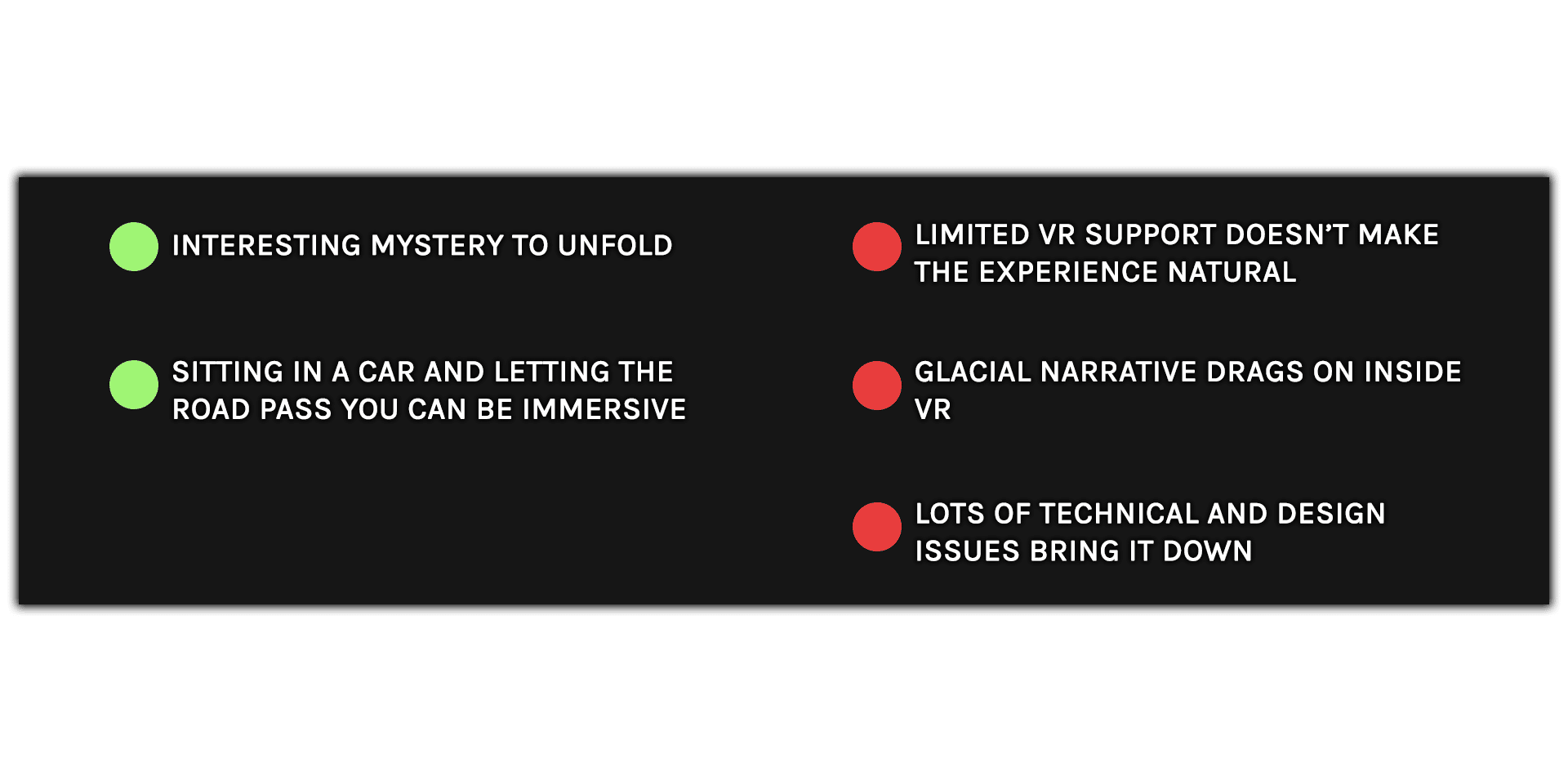 HitchHiker is a game that should work best in VR but ends up as likely the weakest version of an otherwise interesting experiment. The core mystery at the heart of the experience is intriguing, but it’s overly protracted by tiresome conversations, visually bland environments and limited VR design. VR storytelling can’t be as passive as its flatscreen counterparts; it needs, brevity, wit and interaction to hold a user’s attention, otherwise boredom sets in quickly. An abridged version of HitchHiker that allows players to fully immerse themselves in their journey without slogging through 40+ minute, technically imprecise chapters might be a much more compelling experience. As it stands, unless you’re really into mystery narratives, you should probably just keep walking.