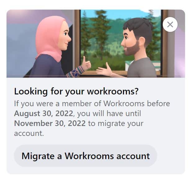 With Meta accounts now required to log into Quest 2 headsets that same account can now get into Horizon Workrooms. There’s still separate profiles for Horizon and Workrooms, but the same account now gets you into the service via both desktop-based video chat and in VR. A pop-up during the migration says users have until November 30th to migrate their account to the new system if you were already a member of Workrooms previously.