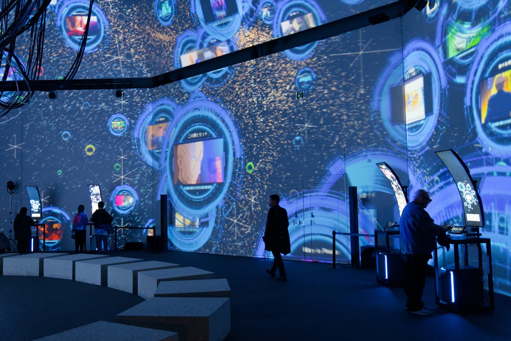 Dotted around the floor of every room of the exhibition are special marks featuring Tachikoma, the cute blue robot from the series. Scanning these marks will trigger an AR scene superimposed over that room or area of the exhibition. The first marker, serving as an introduction to this enhanced walkthrough of the space, places Tachikoma inside the open-plan first room of the showcase in order to explain the franchise and the exhibition, featuring the machine voiced by its original voice actor, Sakiko Tamagawa.