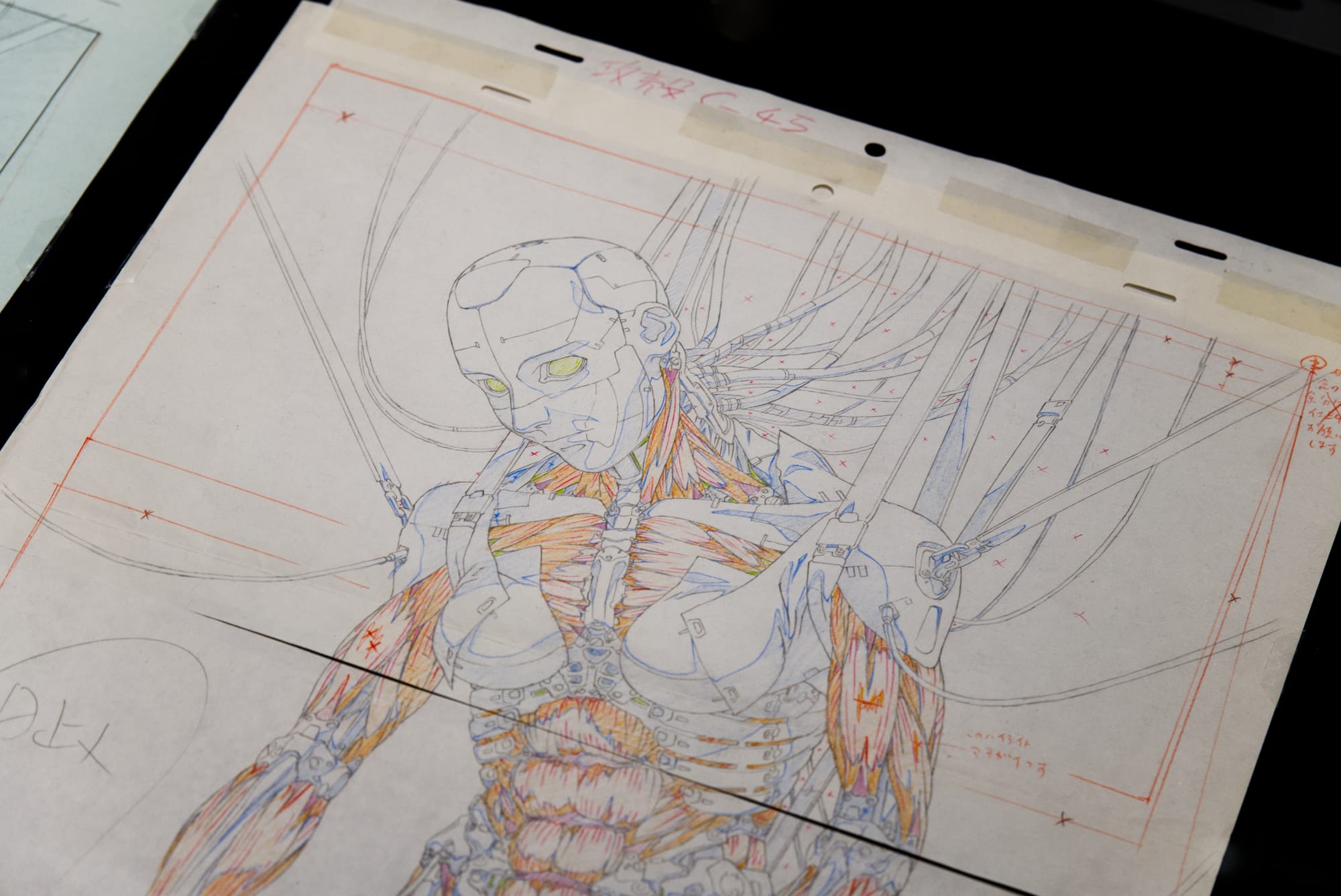 Conceptually, this is the first deep dive into the history of the entire franchise in a single exhibition, showcasing materials used in the production of not just early works but every series and film from the 1995 original all the way until the more recent Netflix-produced CG works, Arise, and an all-new preview for the all-new series from Science Saru premiering later this year. As such, original cels, storyboards, sketches and production materials from every series were on display, alongside newly produced artworks from a range of creatives that explore questions on humanity, AI, technology and the human body posed by the franchise. An analog look at a technological world, as original paper sketches are framed on walls and in glass panels.