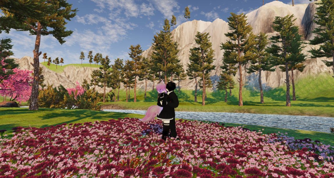 Just browsing around on Twitter you can find some amazing worlds people have made. This one has a hyper-realistic Japan theme. This one looks like something ripped out of a canceled Tron movie. This streamer even surprised his girlfriend with a rose and wrote her a song that he played for her inside VRChat (shown below).