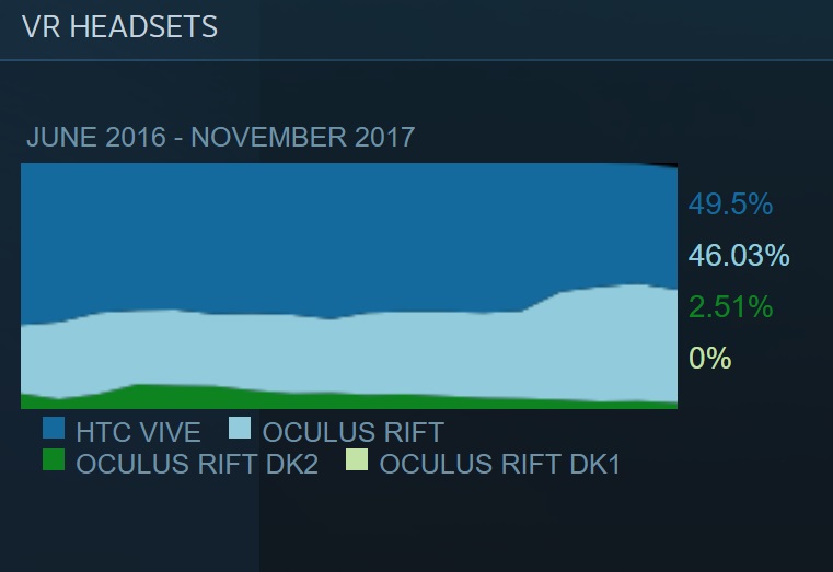 November’s survey results, which Steam users opt into, are now in. They show that the Vive has actually managed to increase its lead over Rift in terms of headset usage on Steam, whereas the past few months have seen the gap shrink. In October Vive held 48.76% of the VR usage on the platform, while Rift held 47.61%, putting just over a percent between the two. In November, Vive’s usage is up to 49.5%, while Rift’s is down to 46.03%.