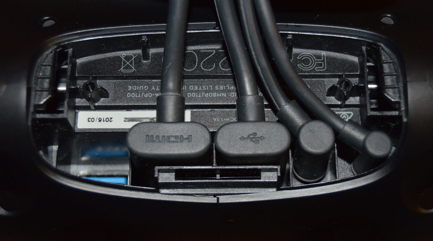 One nifty feature on the headset itself are the ports on the front. Sliding off the piece of plastic covering the cords entering the headset exposes an extra USB port. The port is powered meaning that you can use it for accessories like the Leap Motion. HTC provides a handy angled USB extender that fits snugly alongside the other cords coming out of the headset. We tested a Leap Motion with the port and it ran well – though we had to jerry-rig a mount for the device because of the curved front of the Vive.
