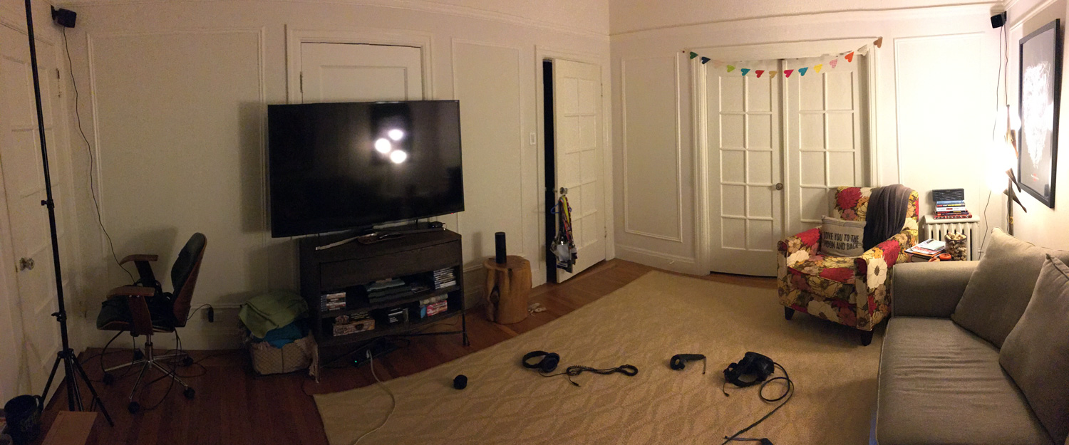 For my setup I mounted the lighthouses about 2.4m off the ground with the included mounts in opposite corners of my living room. (In case you are wondering – a lighthouse can survive an impact on a hard surface from at least 8 feet. I know this because I, uh, tested it several times.) I set them about 5.69 meters apart (which is slightly further than recommended) and angled them each at about 30 degrees downward. Moving my coffee table and a chair out of the way I cleared about 3m x 2.1m of playable space in my living room. Making some minor tweaks after nearly putting a hole in my TV once or twice I ended with a 3m x 1.9m space with a couch and desk chair at the two of the outer edges of the playspace, making them easily accessible for seated experiences. (Pro tip: with this setup it helps to turn off the chaperone bounds when you sit down.)