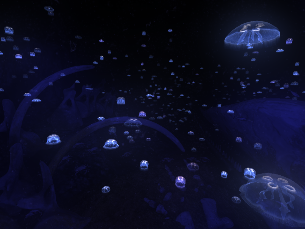 Shining it around I am able to get a better glimpse at the carcass of a giant whale towering over my head. A speck of blue light appears in the distance as I walk over to get a better look – a bioluminescent jellyfish, gracefully gliding upwards toward the surface. I reach out and touch it, shifting it slightly off course as hundreds of other jellyfish fill the scene, casting a beautiful blue hue over the sea floor.
