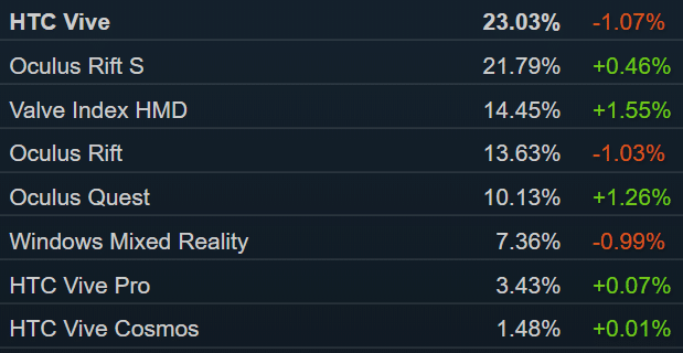 HTC’s Vive Cosmos, the replacement for the original Vive, remains stagnant in the survey, unable to make its case between the affordable Rift S and high quality Valve Index. The Hardware Survey now lists the SteamVR-tracked Cosmos Elite variant, which saw minor growth.