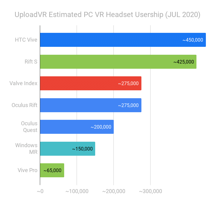 Facebook’s Oculus Rift S replaced the original Rift with a different approach, optimizing for a much lower launch price of $399. It uses fixed lenses and low quality mini speakers in the straps for basic audio. Though Rift S is used more on Steam, the difference is no longer as dramatic as it was.